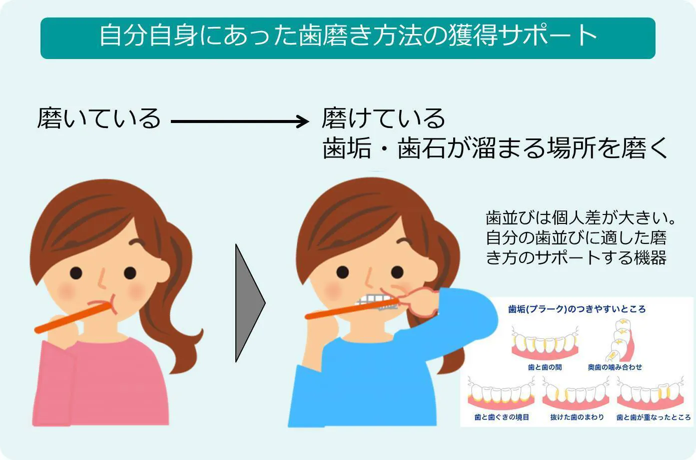 この技術は、ご自身で行うセルフケアと歯科医院のプロケアをサポートし、より効果的な口腔ケアを実現します。