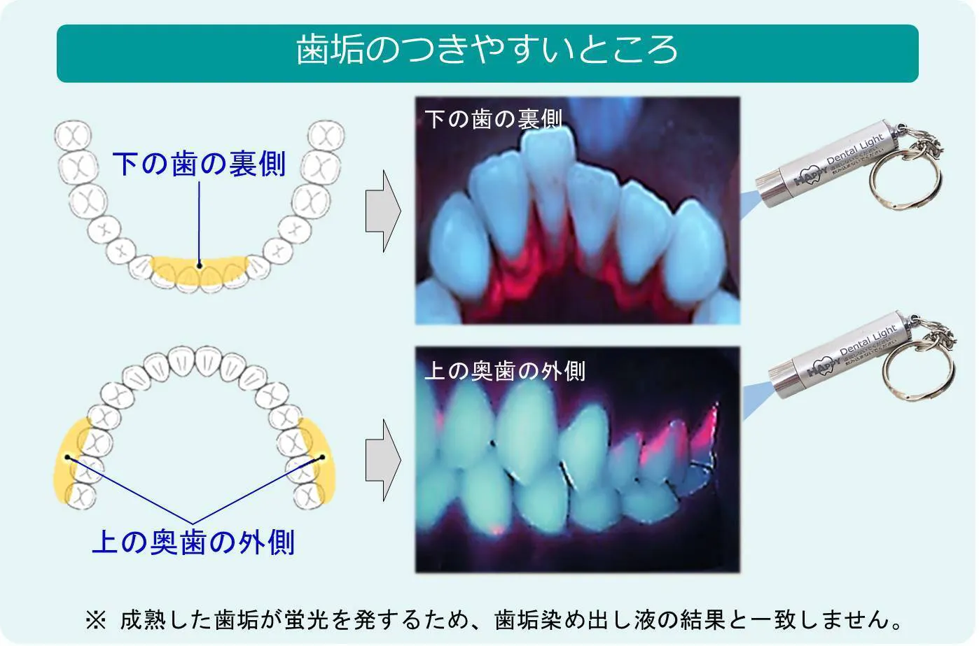 ※この製品は、お口の中のプラーク(細菌)に反応しますが、歯垢着色液で染まる食物残差(食べかすなど)やだ液由来のたんぱく質(ペリクルなど)を視覚化する機器ではなく、主に成熟したプラークを可視化する機器です。