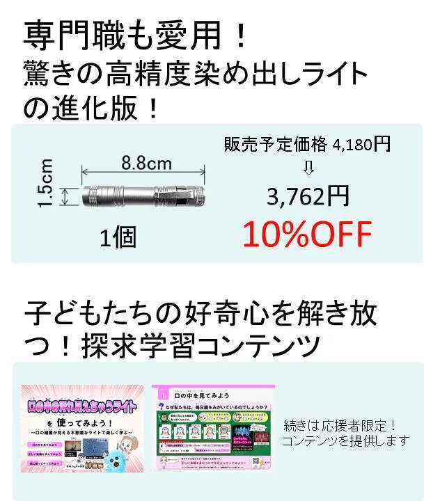 ご支援いただいた資金は、次期モデル開発と、未来への投資として、歯垢着色液に代わる新しい学校教育教材コンテンツ開発に活用させていただきます。
