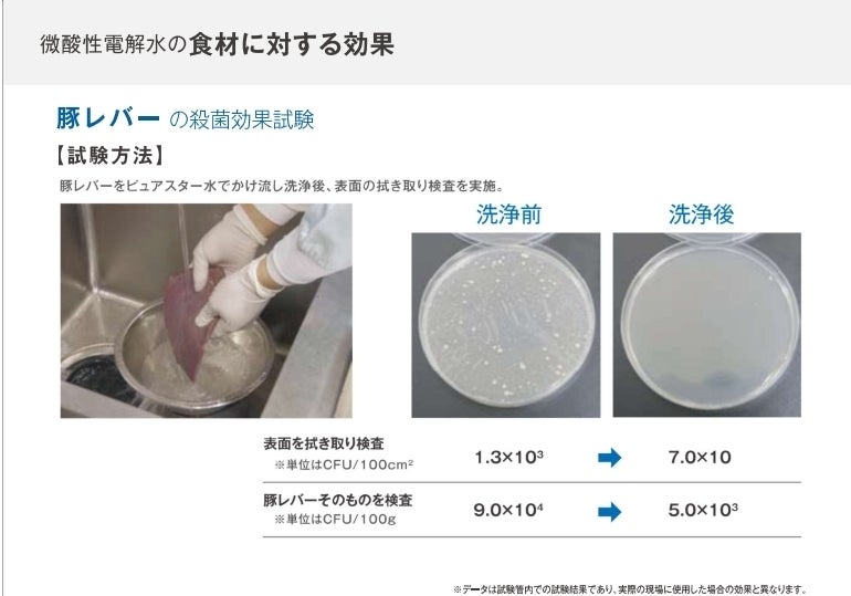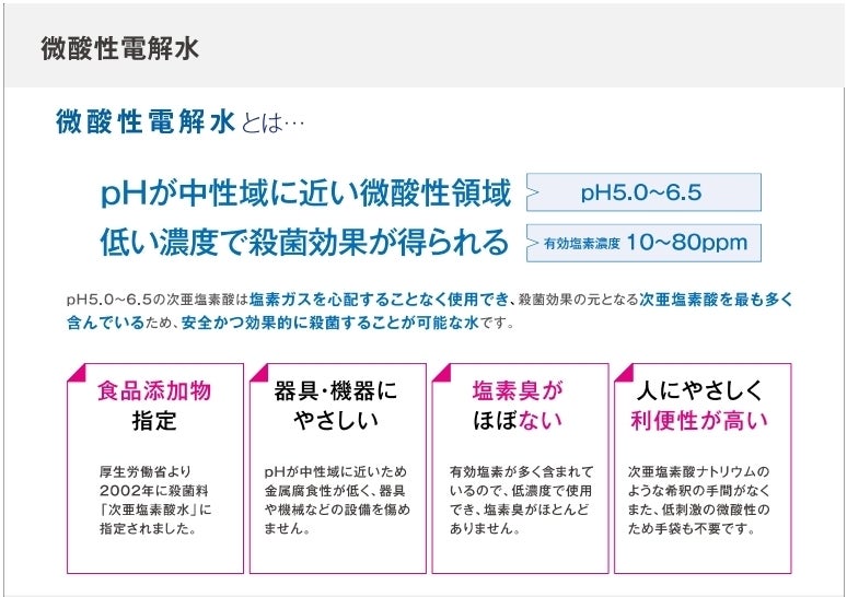 一方で微酸性電解水の場合はph値が中性に近いため、加工器具の金属腐食性が少なく安心して加工器具の殺菌に使用できます。また厚生省より食品添加物の認可を受けているため、馬肉の表面にかけても味や風味を損なうことなく安全にお召し上がり頂けます。