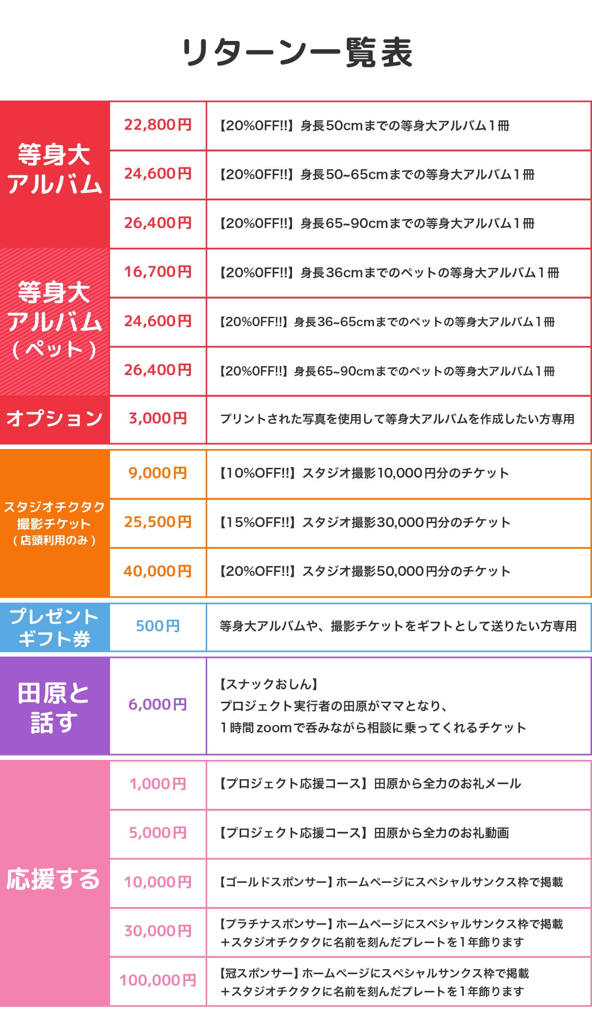 ご支援いただいた方々には、さまざまな特典をご用意しています。まず、最も基本的なリターンとして、等身大アルバムを割引価格でご提供させていただきます。