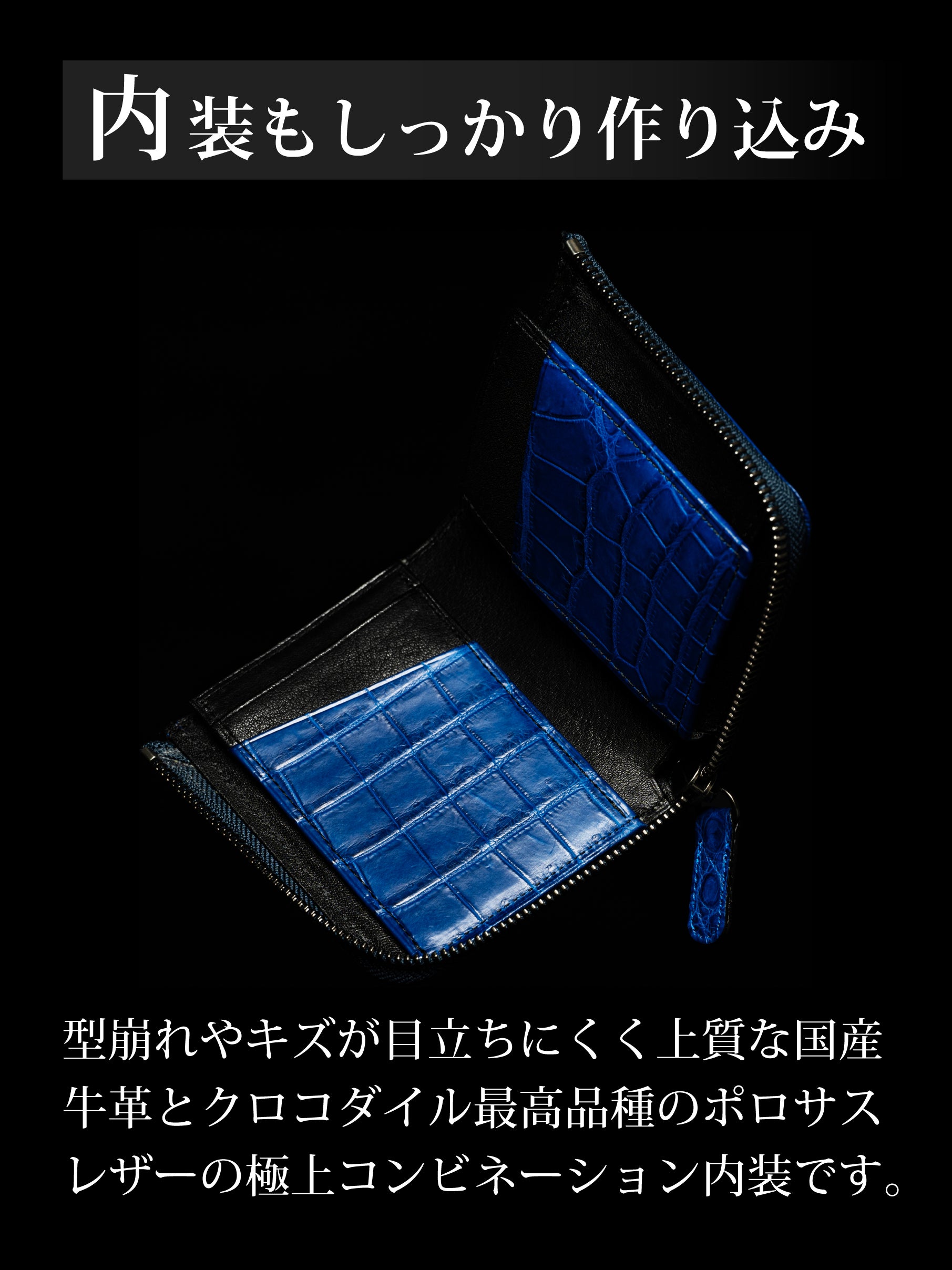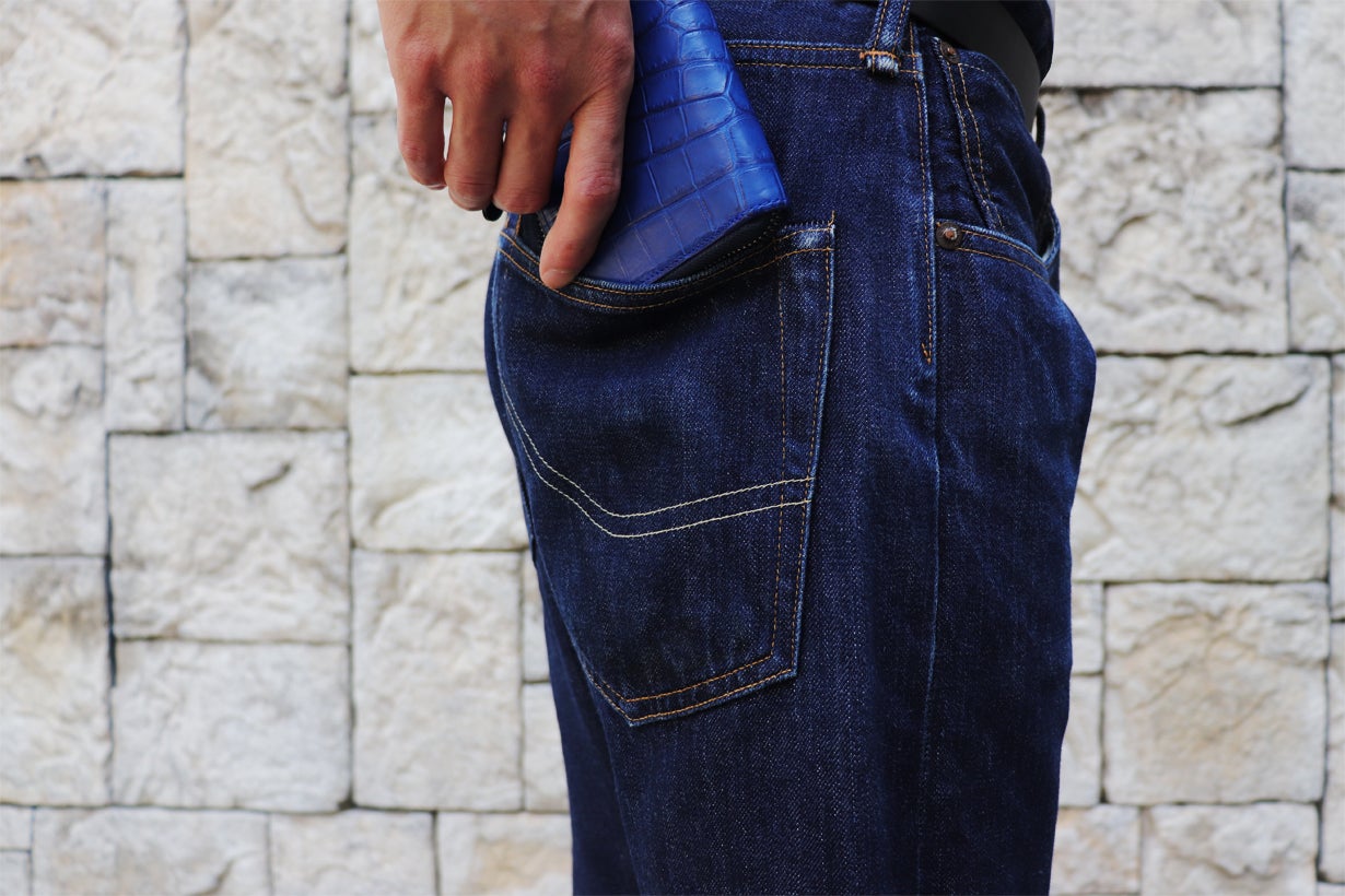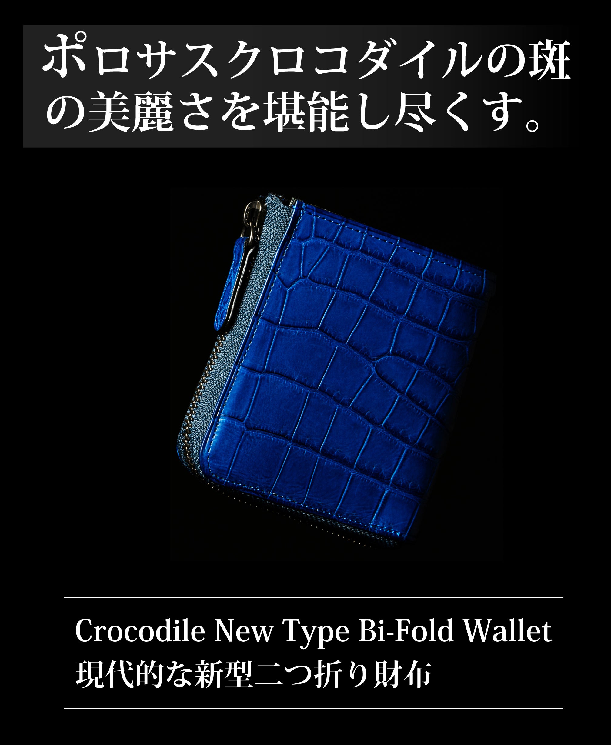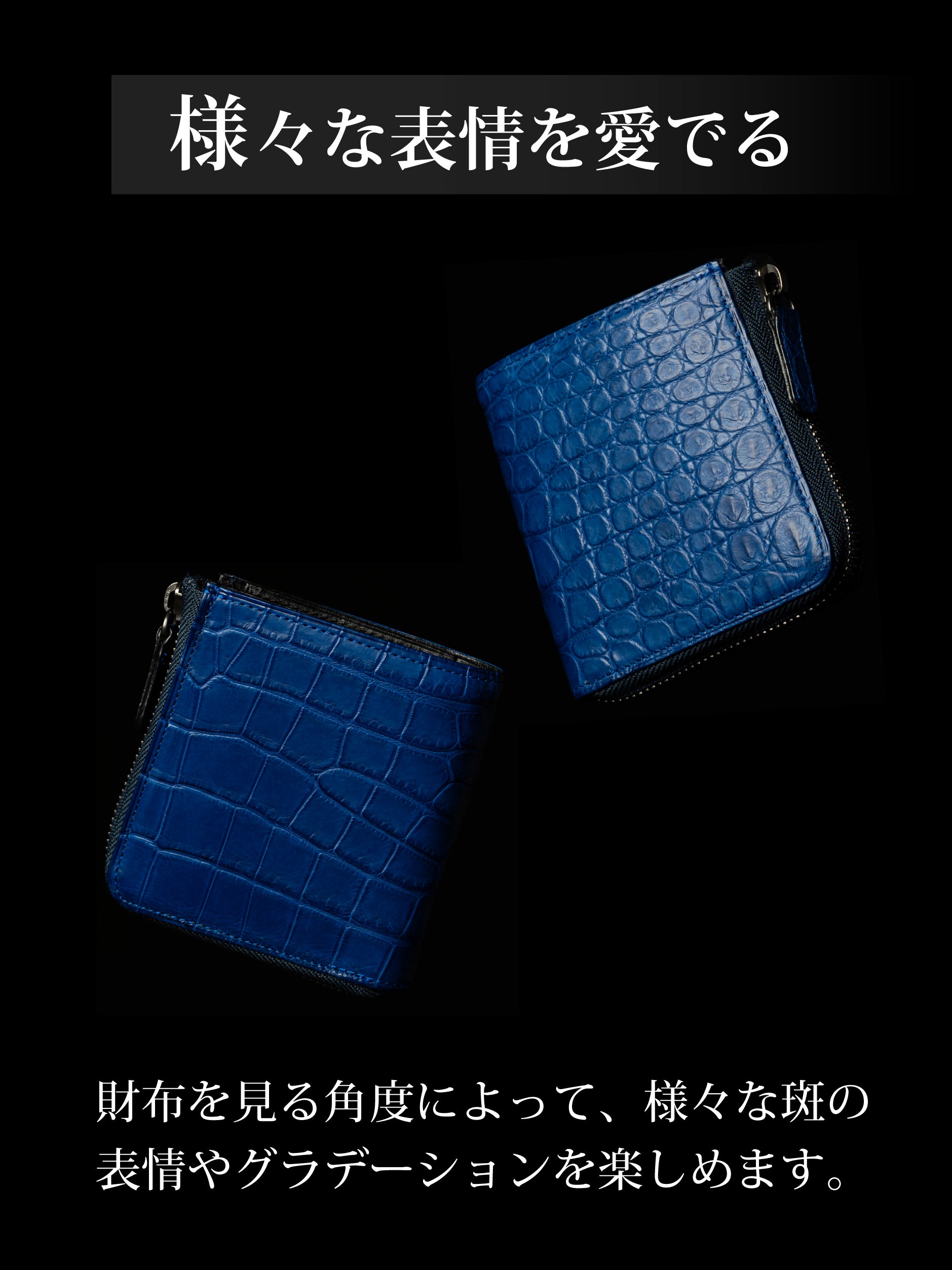 ※本文中にも記載しておりますが、製品によって色味、斑模様が異なります。本製品のクロコダイル使用部位については、原則として外装は腹部や顎部分を使用しています。また内装のカードポケットには尻尾部分を使用しています。生き物から頂いた革を端から端まで余さず取り切るため、向きや角度を考慮して熟練のエキゾチックレザー職人自ら裁断を行なっています。その為、斑模様や斑サイズ、竹斑と丸斑バランス、クロコダイルの個体サイズ、使用部位、縦や横の裁断方向、色味、その他も含む個別の指定はできかねます。予めご了承くださいませ。