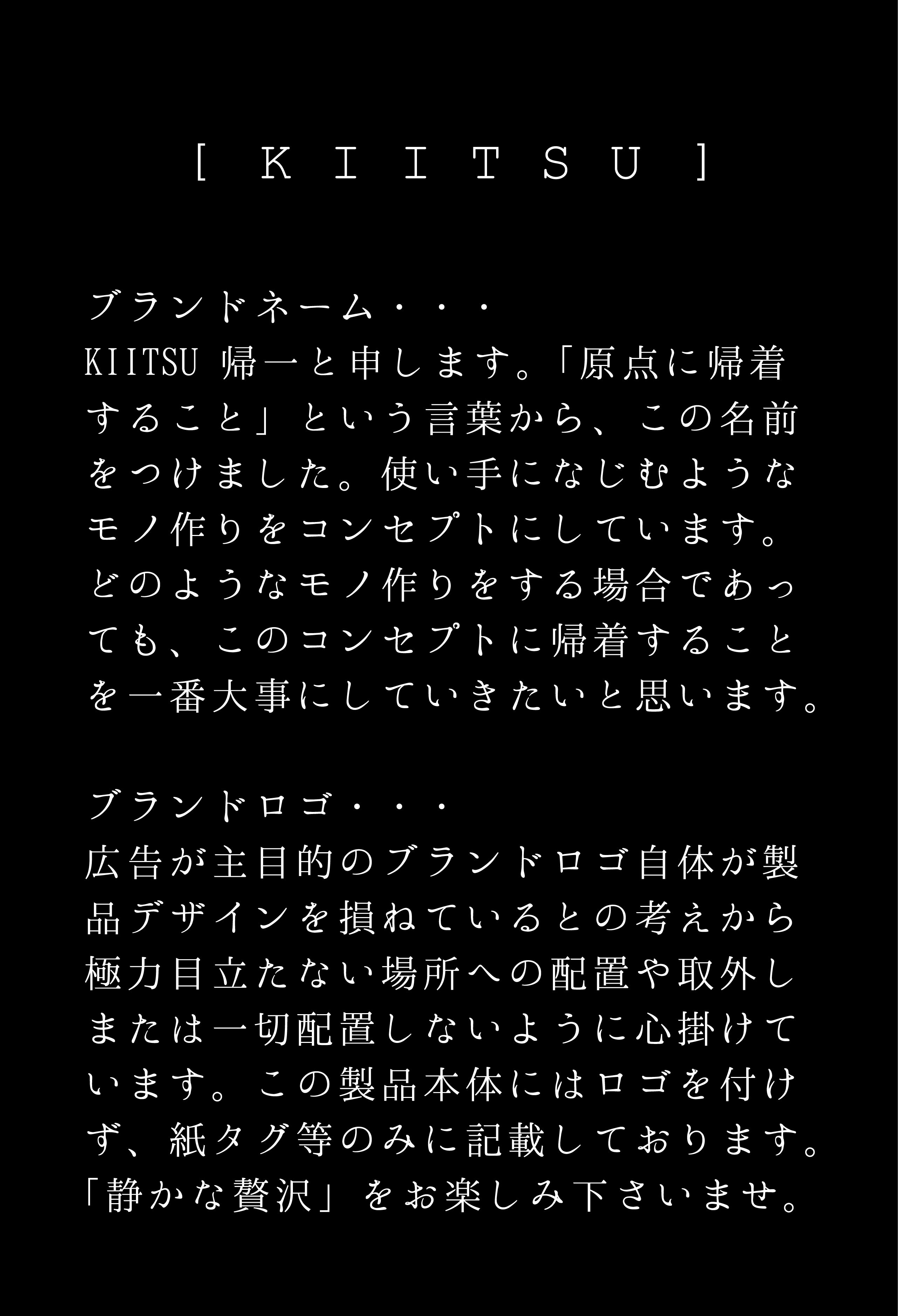 KIITSUは製品コンセプトに応じて、デッサンを描き、設計図に線を引き、模型を作るという当たり前の作業をしっかり入念に行っています。その為、ブランドロゴだけをかえて中身は一緒というような製品とは全く理念が違います。一点一点を細部にまで工夫を凝らして製品に落とし込みを行っています。百貨店にもセレクトショップにも欲しいモノがないという方は結構いらっしゃると思います。そういった皆様にも是非手にとって頂きたいです!