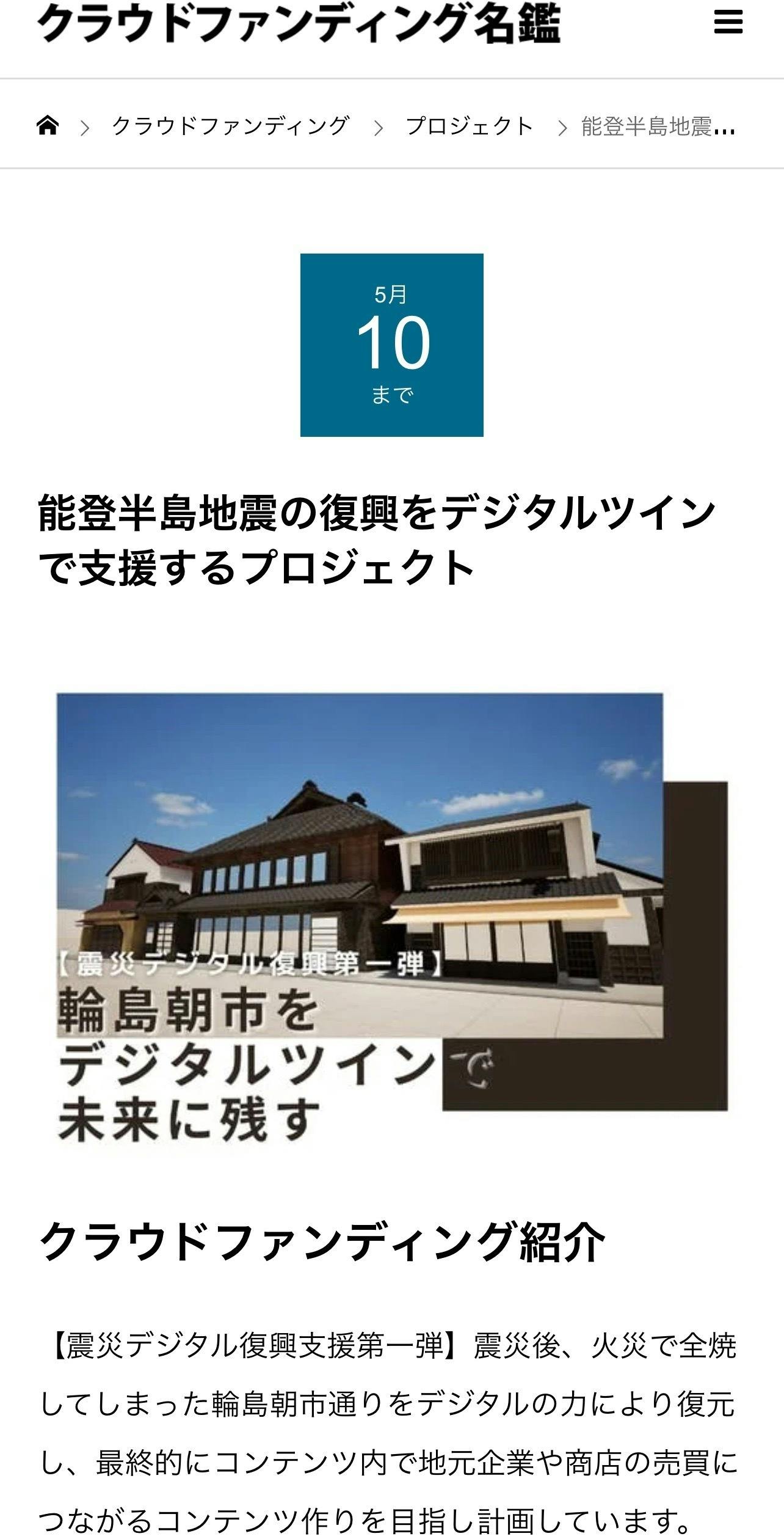 2024/02/27 11:22ご覧いただきありがとうございます、合同会社月香です。この度【クラウドファンディング名鑑】にて紹介をしていただきました!https://crowdfunding.meikan.org/project/campfire-741403/既にご支援いただきました皆様には多大なる感謝を申し上げます。現在制作南側を中心に開始し、錦川通り側から約20軒の制作が進んでおります。テクスチャや細部が粗かったり、1戸1戸を別で制作しておりバラバラの状態ですので、お見せできるのはまだまだ先となりますが、早くお見せできるよう努めてまいりますので、ご支援のほどよろしくお願いいたします。能登半島の1日でも早い復興を願っております。 もっと見る