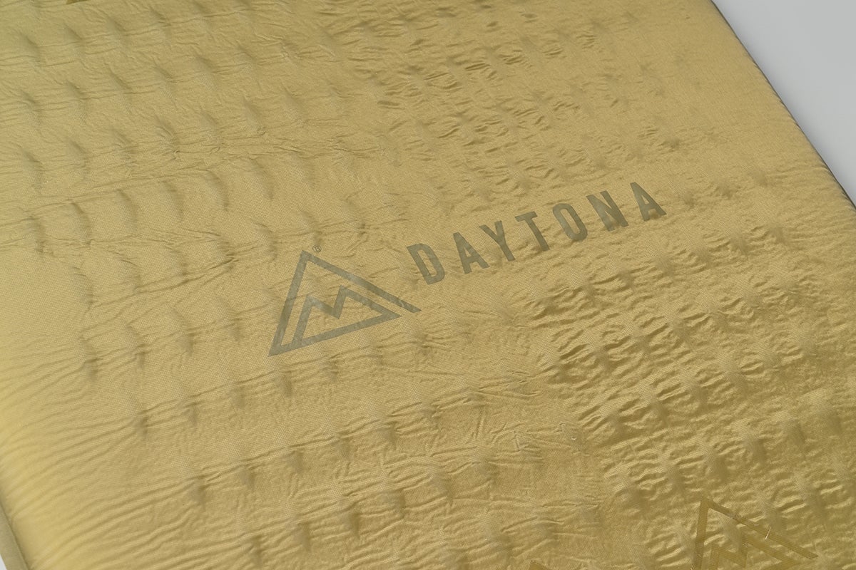 前作開発で、譲れなかったのが、サイズと重さ。当初、ウレタンマットには75デニールの生地を使っていました。厚手で快適なんですが、どうしても重くなってしまい、試作段階では1kg弱ほどでした。そこで、高価ですが軽くて薄手の20デニールの生地に変えて試作しました。しかしそこで問題発生。使ってみるとツルツルして滑りやすく、メンバーからは「75デニールに戻した方がいいのでは?」という声もありました。シンプルな別モデル(当社デイトナ製)インフレータブルマットの重さが1000gなので、それより大幅に軽量化できないのであれば、作る意味がありません。そこで、滑り止めとしてロゴマークをシリコンプリントすることで、生地を変更することなく課題をクリアすることができました。