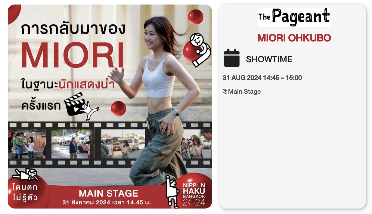 2024/08/30 23:36大ニュースです!映画「The Pageant」に主演した大久保美織さんが、すごいイベントに登場するというニュースが飛び込んできました!8月31日にバンコクで開催される「バンコク日本博」に出演するそうです!出演紹介ページはこちら↓↓↓https://nipponhaku.com/artists/miori-ohkubo/そして、美織さんの紹介ページには映画「The Pageant」の文字も…!バンコク日本博でその魅力をたっぷり語ってくれるそうですよ。映画「The Pageant」は、9月8日に日本では東京の豊洲で1Day上映会が決定!日本初公開までもうまもなくです!チケットは残りわずか。観覧をご希望の方は、こちらからお求めください。1枚購入https://event.impacthouse.jp/the-pageant-movie98/2枚まとめ買いhttps://pay.hotmart.com/N94171415A?off=i6tjyv1t3枚まとめ買いhttps://pay.hotmart.com/N94171415A?off=yerbay1m子供用決済https://pay.hotmart.com/N94171415A?off=8fiqv3v09月8日の1Day上映会でお会いしましょう!==============映画「The Pageant」事務局support@imacthouse.jp もっと見る