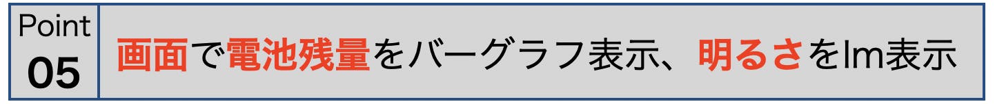 今までのLEDによる大まかな電池残量表示から脱却し、電池残量とルーメンレベルを表示する画期的なミニスクリーンを導入しました。
