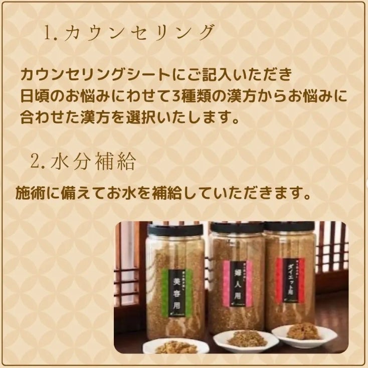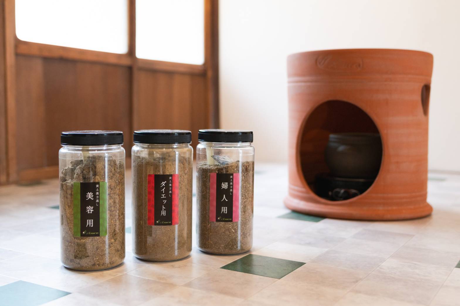 薬草は厳選された高級漢方を使用しています。東洋医学のプロである専属の漢方医が、ヨモギ(艾葉ガイヨウ)をはじめとした、26種類の薬草をブレンドした薬草です。「美容用」「婦人用」「ダイエット用」の3種類があります。