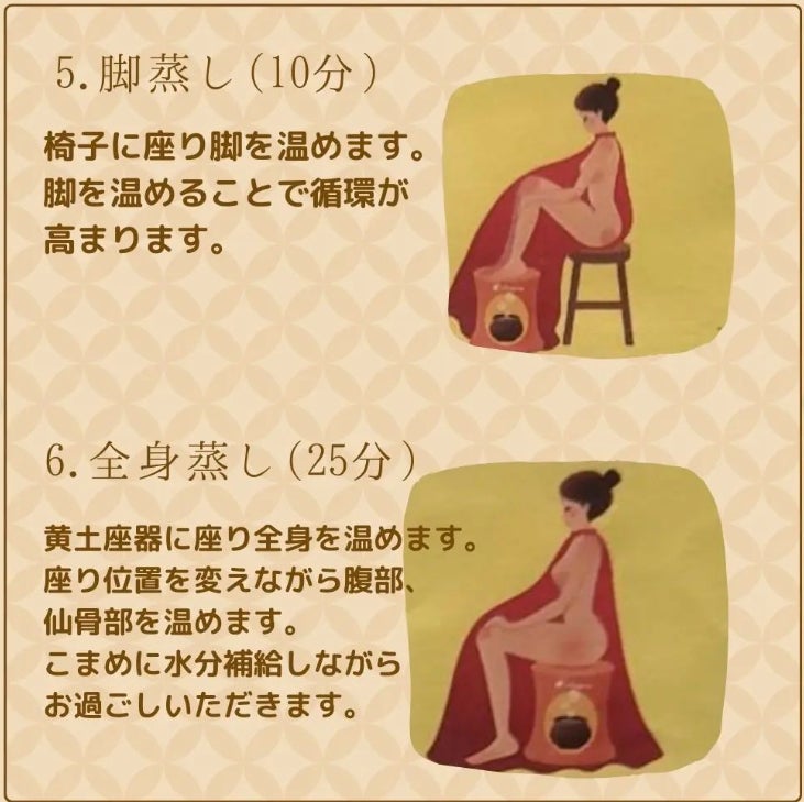 椅子も黄土の椅子を使っており、そのためにより温まり、より薬草の有効成分を身体に送り届けられます。
