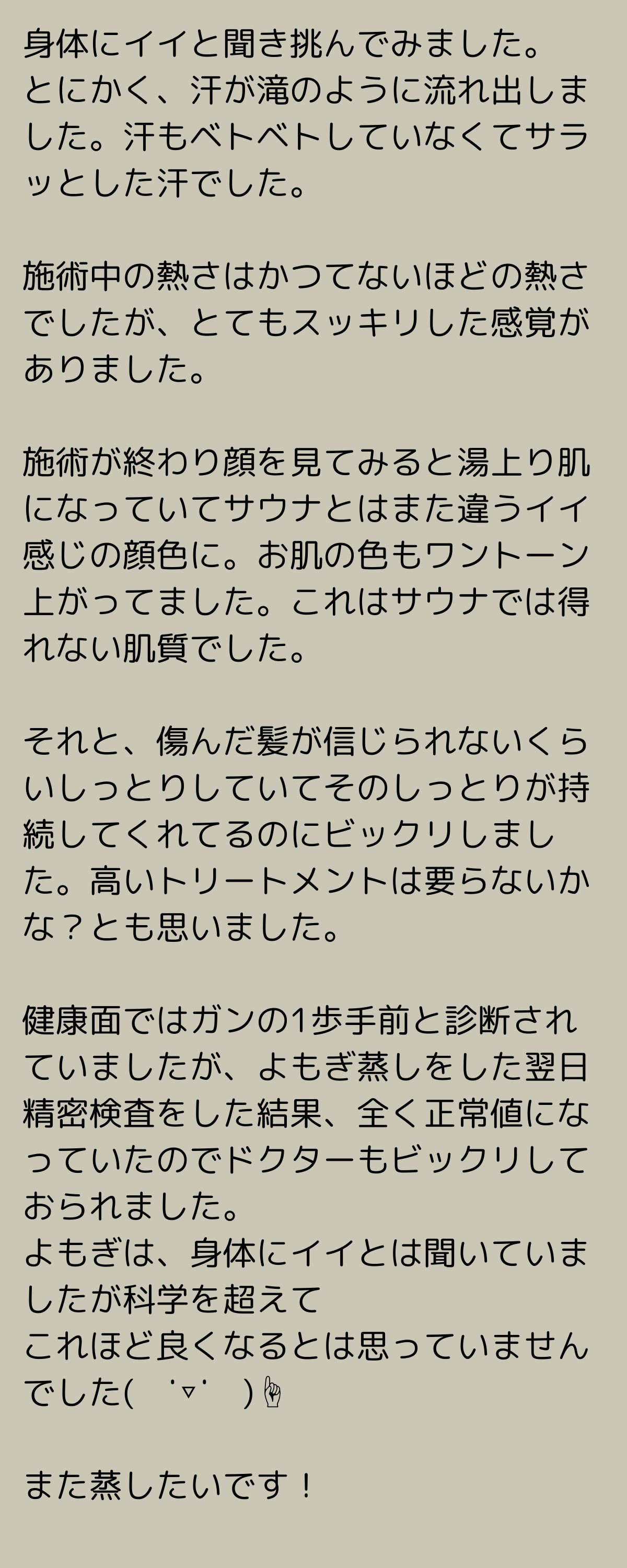 他にもコロナの後遺症で嗅覚や味覚が鈍っていた方が嗅覚と味覚が正常になったとか、乾燥肌の方がよもぎ蒸しをするうちにお風呂で肌が水をはじくようになったと言っていました。
