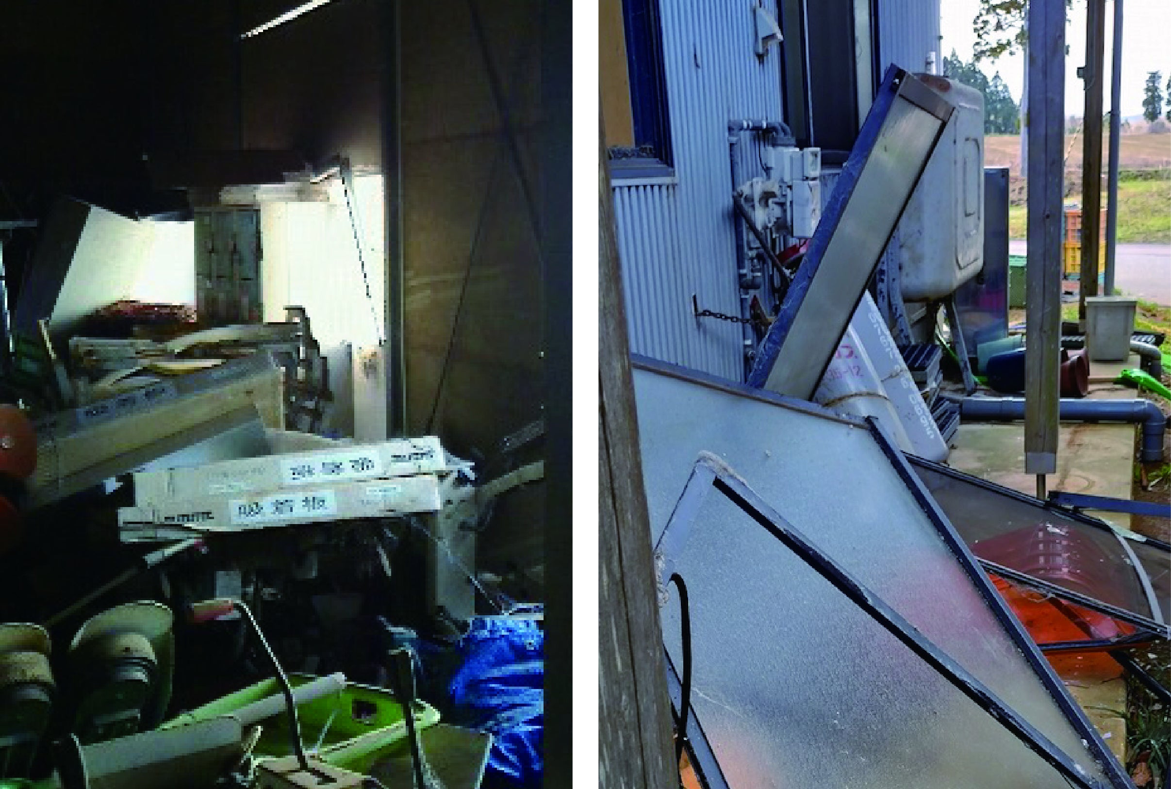 ※納屋のなかは足の踏み場もない状態で農機具も破損、事務所窓も外れ割れてしまいました。
