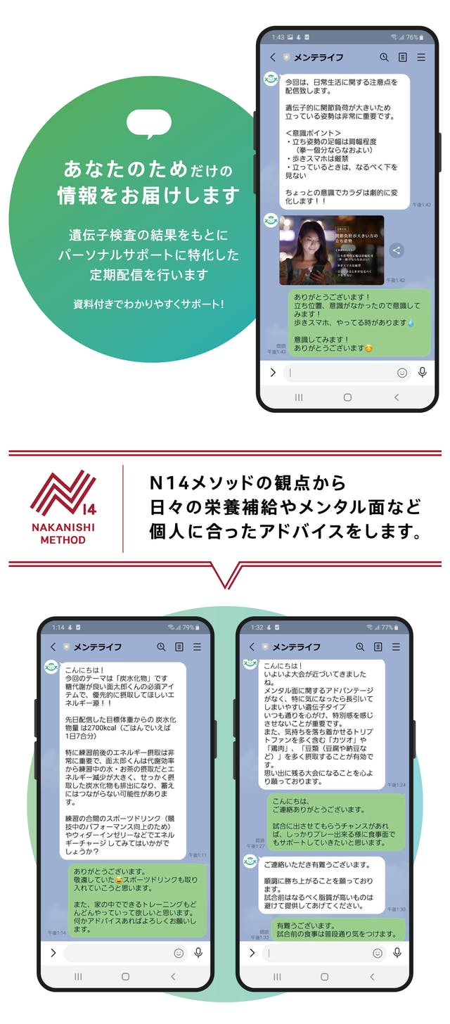 プロアスリートを指導するN14メソッドの中西哲生や管理栄養士、トレーナー・睡眠など専門家があなたの遺伝子検査結果に合ったアドバイスを定期的に配信。