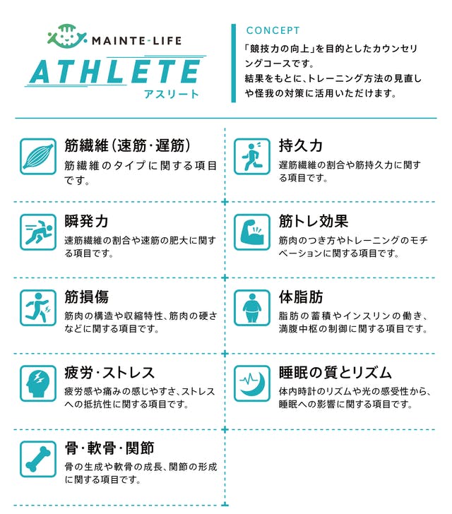 サッカーや野球、ゴルフやテニスなど様々な競技の特徴に合わせて「フィジカル」「ボディーケア」「メンタル」「食事」のアスリートシートを作成し、遺伝子検査からみたあなたの特徴を把握しアドバイスします。