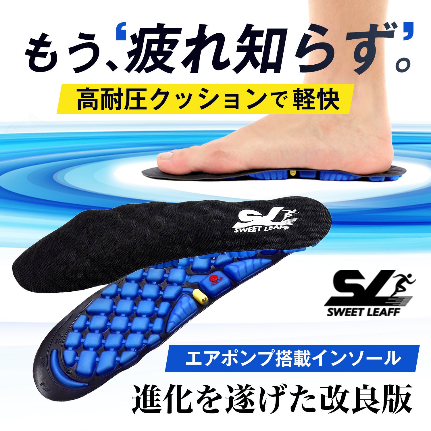 日々の歩行や立ち仕事による足や腰の消耗、【エアポンプ搭載インソール】が新しい解決策を提供します。エアクッションが衝撃を柔らかく吸収し、足裏から膝、腰までの負担を軽減。一日中の快適さをサポートし、活発な活動を実現します。