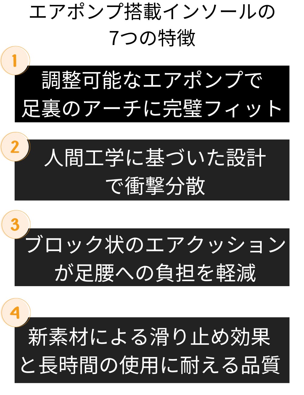 エアポンプ搭載インソールは、瞬時の動きにもしっかりと対応し、足裏を安定的にサポートします。長時間の使用にも耐えるこの耐久性が、毎日の足元をより快適にしてくれるのです。