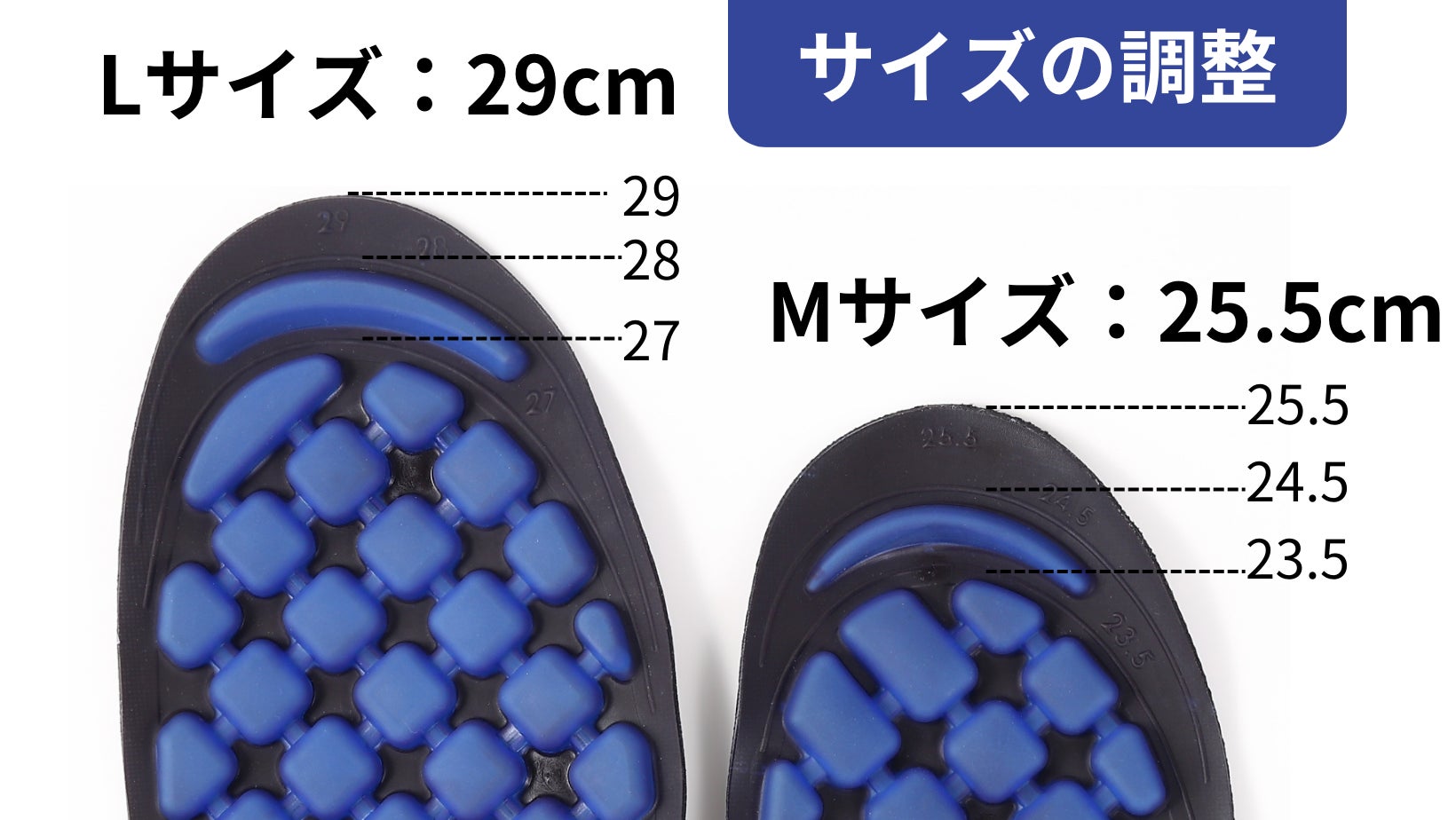 Mサイズは25.5cm、Lサイズは29cmに設定されています。