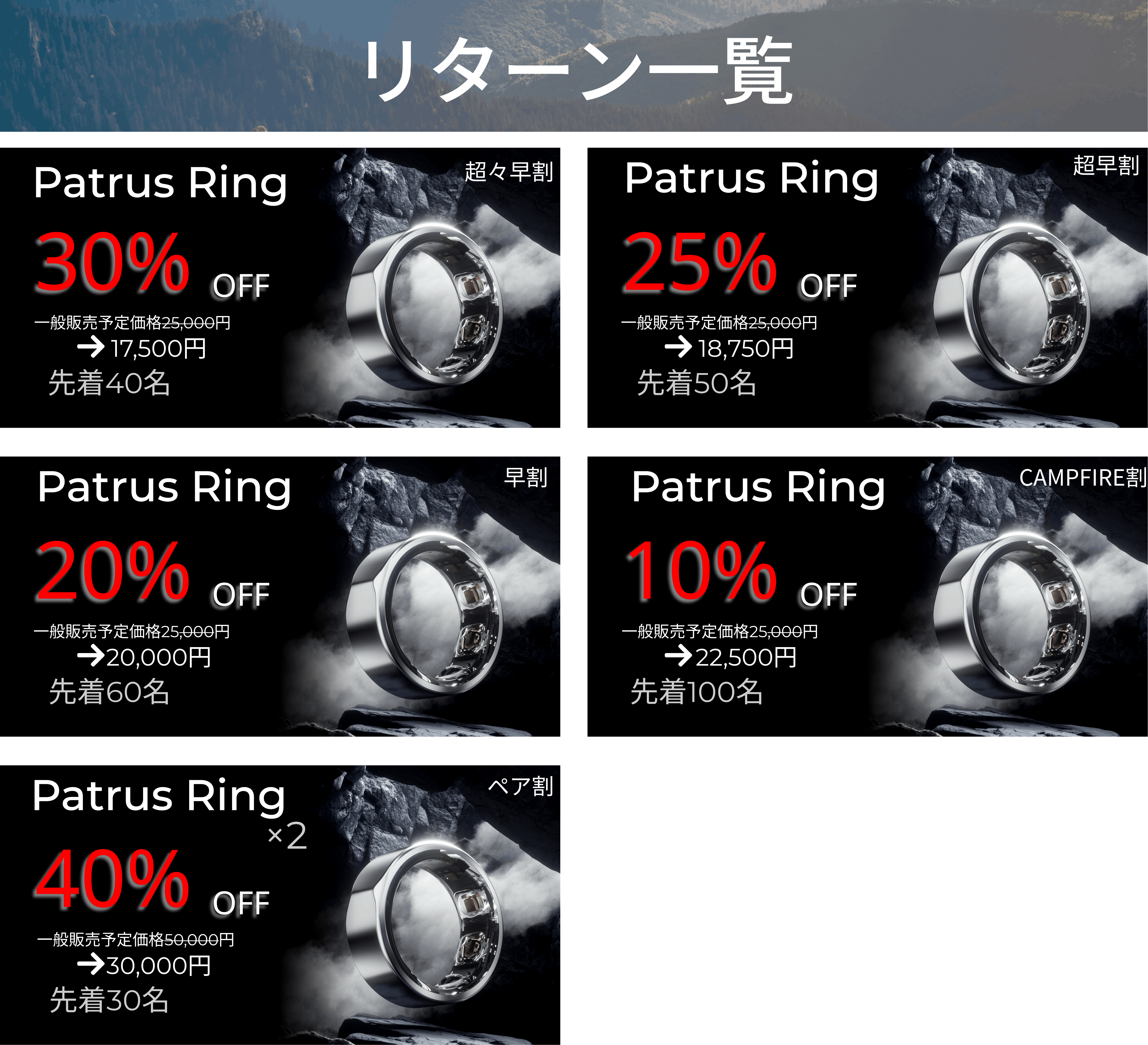 製品の一般販売予定価格25,000円のsmart ringを、以下の割引価格で、先着順で販売いたします。
