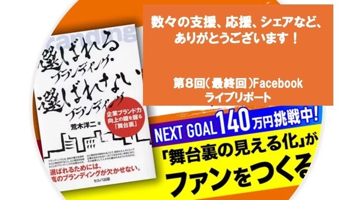 2024/05/31 18:30皆さん、こんばんは。最後まで温かいメッセージやご支援に心から感謝申し上げます。ありがとうございます。最終日に入っても変わらぬご支援、重ねてお礼を申し上げます。今朝から10件、新たなご支援がありました。テーマソング『chosen one』のMV(ミュージックビデオ)に企業ロゴを載せる権利(80,000円)にも支援者が現れました。なんと、名前を載せる権利(10,000円)も5人の支援者がいます。5人のかたには、まず、クラファン終了後、6月中に書籍4冊を発送します。ぜひ親しい人、お知り合いの人に贈呈していただけると幸甚です。現時点で190人からご支援いただき、達成率は143%です。2ndゴールに設定した140万円まで、残り25万円ほどです。最後まで諦めずに挑戦します。この追加分の60万円は新聞広告3回分に当たります。より多くの人に拙著を届けたい! そんな思いがあり、広告を出稿したいと考えています。1回20万円で計算すると、合計3回出稿できます。最も多くの人に届けられる手段を十分吟味して実行します。広告出稿が正式に決定した際には当活動報告ページで報告しますね。すでに視聴しているかもしれませんが、以下よりテーマソングMVのトレイラー動画を視聴できます。本編最後に「Special Thanks」として企業ロゴ、指定いただいたお名前を掲載します。正式公開の日程も決定次第、報告します。本日15時過ぎ、西川寿美礼さんとの最後のFacebookライブを行いました。全8回のアーカイブは以下より視聴できます。・第1回:4月12日配信・第2回:4月19日配信・第3回:4月26日配信・第4回:5月 3日配信・第5回:5月10日配信・第6回:5月17日配信・第7回:5月24日配信・第8回:5月31日配信最終回は当クラファンに挑んだ2カ月間(本日24時で66日)を振り返りました。西川さんも今まで2度、クラファンに挑戦しています。西川さんからは自身の体験(ストーリー)を語ってもらいました。西川さんの2回目のクラファンでは30日間、毎日Facebookライブを行ったそうです。これはなかなかできることではありません。地道に伝え続けることが広報の王道です。それを実践したのですから大したものだと思います。驚嘆かつ感心しました。私からは2カ月間での体験(ストーリー)をいくつか伝えました。途中からリターンに私の本業のサービスを全部で3種類、加えました。その3種類全て支援者が現れたことは最も感慨深いことの一つでした。当社が想定するクライアントは社員50人以上の企業がメインです。対象となる企業の社長が「創業ストーリーを記事化する権利」と、担当社員のために「広報の基本が分かるeラーニング講座 3カ月学び放題の権利」を選んでくれたことは大変励みになりました。挙げるときりがありませんが、一度しかリアルでお会いしていない社長が創業ストーリーを、最近交流が少なかった社長が広報のeラーニング講座を選んでくれました。広報の本質を伝えたい若き「広報人」、広報に取り組むコンサルタント、広報に関心がある人、某企業の広報担当者など。そのほかにも実に大勢の人たちに支援していただきました。一つ一つの支援に対して驚きや喜び、感謝など、さまざまなことを感じました。残すところ、あと6時間を切りました。最後まで挑戦していきます。皆さんの変わらぬご支援をどうぞよろしくお願い申し上げます。 もっと見る