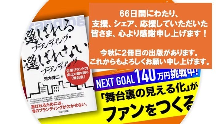 2024/06/01 00:30皆さん、夜分に申し訳ありません。66日間にわたるクラウドファンディングの挑戦が先ほど終わりました。結果は次のとおりでした。・支援総額:1,201,350円 (直接的な現金支援として、プラス30,000円)・達成率 :150%(154%)・支援者数:195人(197人)200人に迫るほどのかたがたにご支援いただきました。複数回にわたり支援してくれた人、複数のリターンを一度に選択してくれた人、SNSでシェアしてくれた人、支援とシェアしてくれた人、さまざま形でのご支援に心より感謝申し上げます。誠にありがとうございました。各リターンの実施、リターン実施のリポート、今秋の2冊目の出版など、当クラファンサイトでは発信を続けます。今後とも良きご縁を続けていけるよう、私自身精進していきます。どうぞよろしくお願い申し上げます。66日間、お付き合いいただき、ありがとうございました! もっと見る
