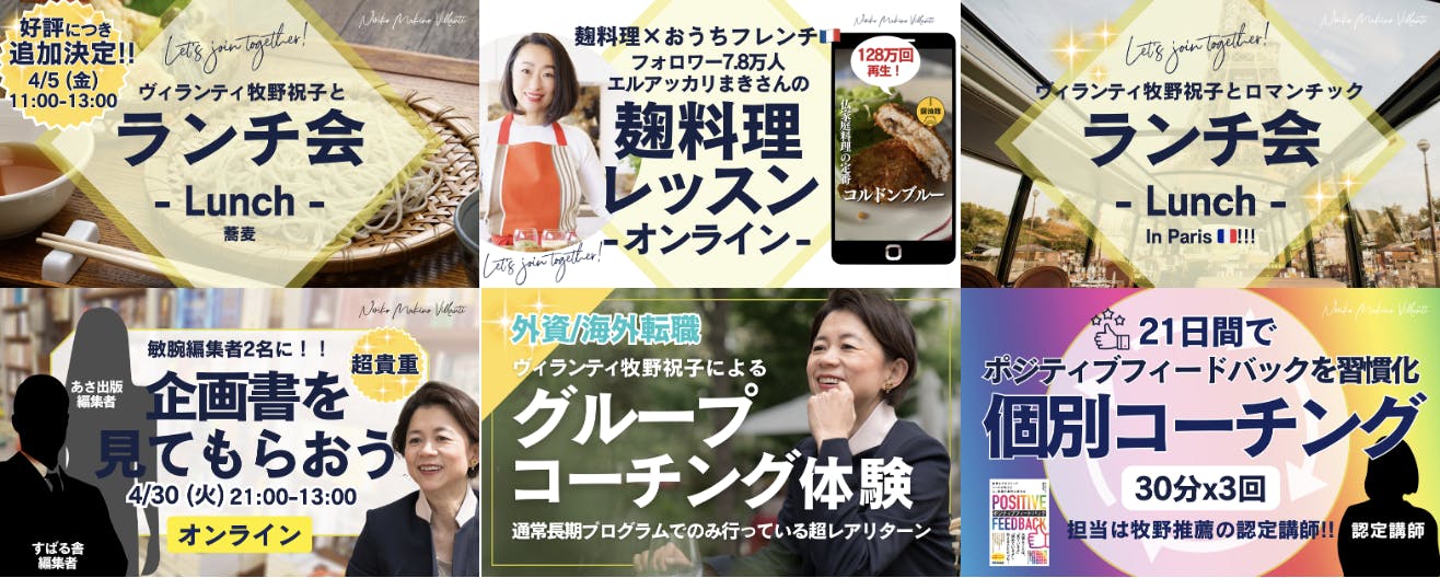 (ご紹介:上段左から時計回りに)即SOLD OUTになったお蕎麦ランチ会を追加!、フォロワー7.8万人の麹料理研究家&腸活コーチ エルアッカリまきさんによる再生回数128万回コルドンブルーレッスン(オンライン)、レストランバスでパリの観光地をめぐりながら祝子とロマンチックランチ3H、21日間でポジティブフィードバックを実践し人間関係が改善する認定講師による個別コーチング30分×3回、長期コーチングプログラムで提供している公開グループコーチングを体験!(外資・海外転職希望者向け/起業・副業したい人向け/企業内キャリアアップしたい人向け)、敏腕編集者2名から本の企画書にフィードバックをもらえる「超」レアな会!