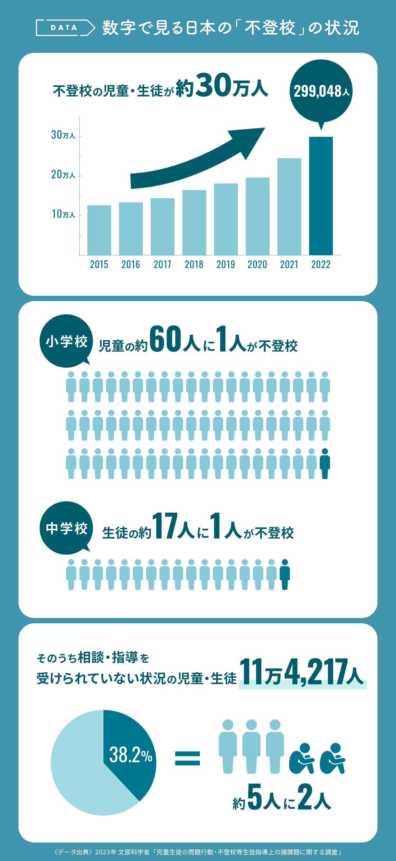 文部科学省の調査によれば、不登校の小中学生の人数が10年連続で増え続け、約30万人になりました。そのうち、約5人に2人が相談や指導につながることができていません。
