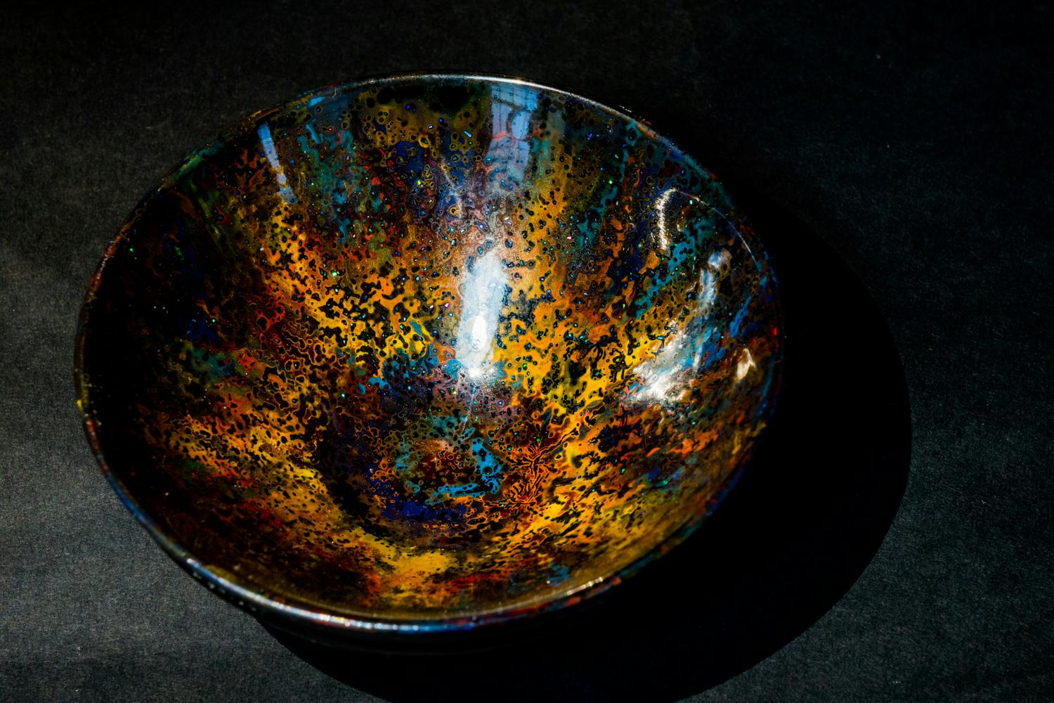 漆<うるし>は乾燥しても、作品の内部で生き続けていることから、透明感を増します。漆は年数を経て、徐々に透明になり、透けてくるなど、幾度も塗るうちに色がプリズムのように、光を吸収・分散・屈折して、はじき出し、異なる輝きを見せます。