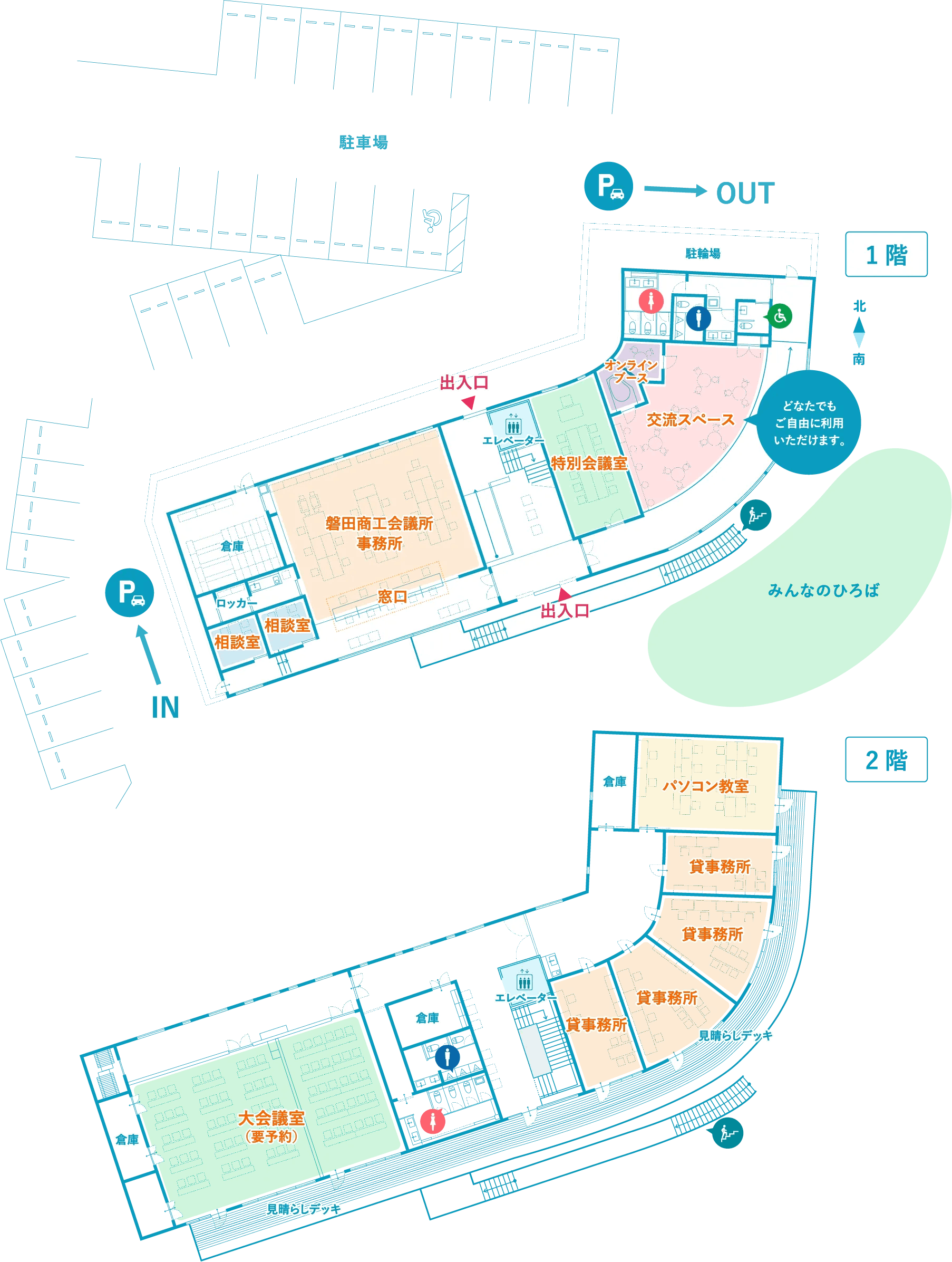 新会館は、鉄筋2階建です。1階と2階ではスペースの役割を変えていますので、ご紹介していきます。