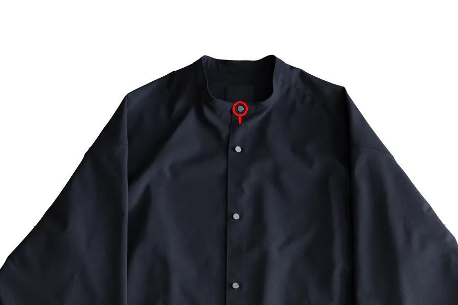 バンドカラー部分の第一ボタンの位置がバンドカラーよりも少し下の配置に修正になります。ご了承ください。