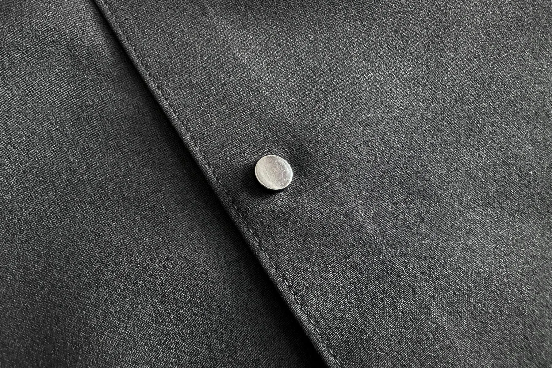 カフスのボタンもブラインドホックで統一感を出しています。パチンと外せるので、腕をまくるときも便利です。