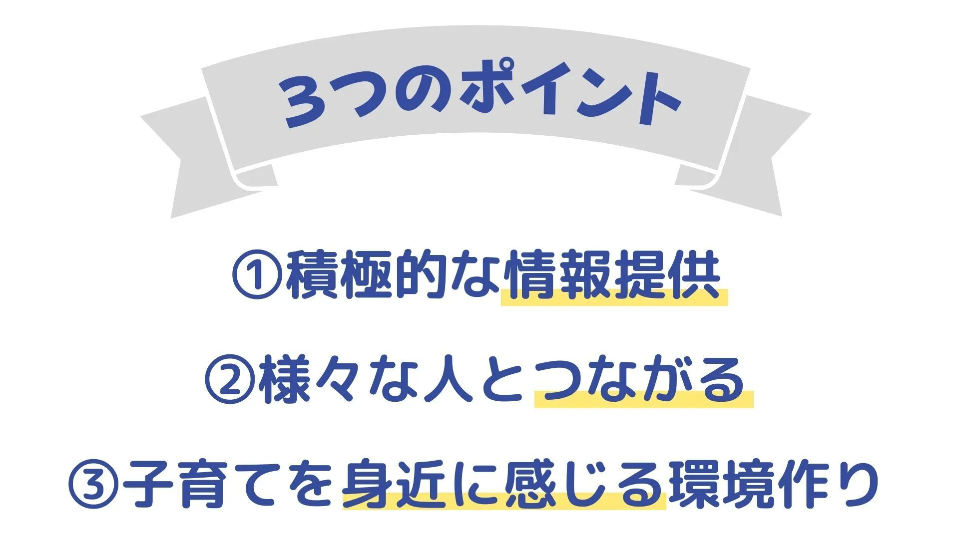 イベントでは3つの視点から子育て環境の改善を図ってきたいと考えております。