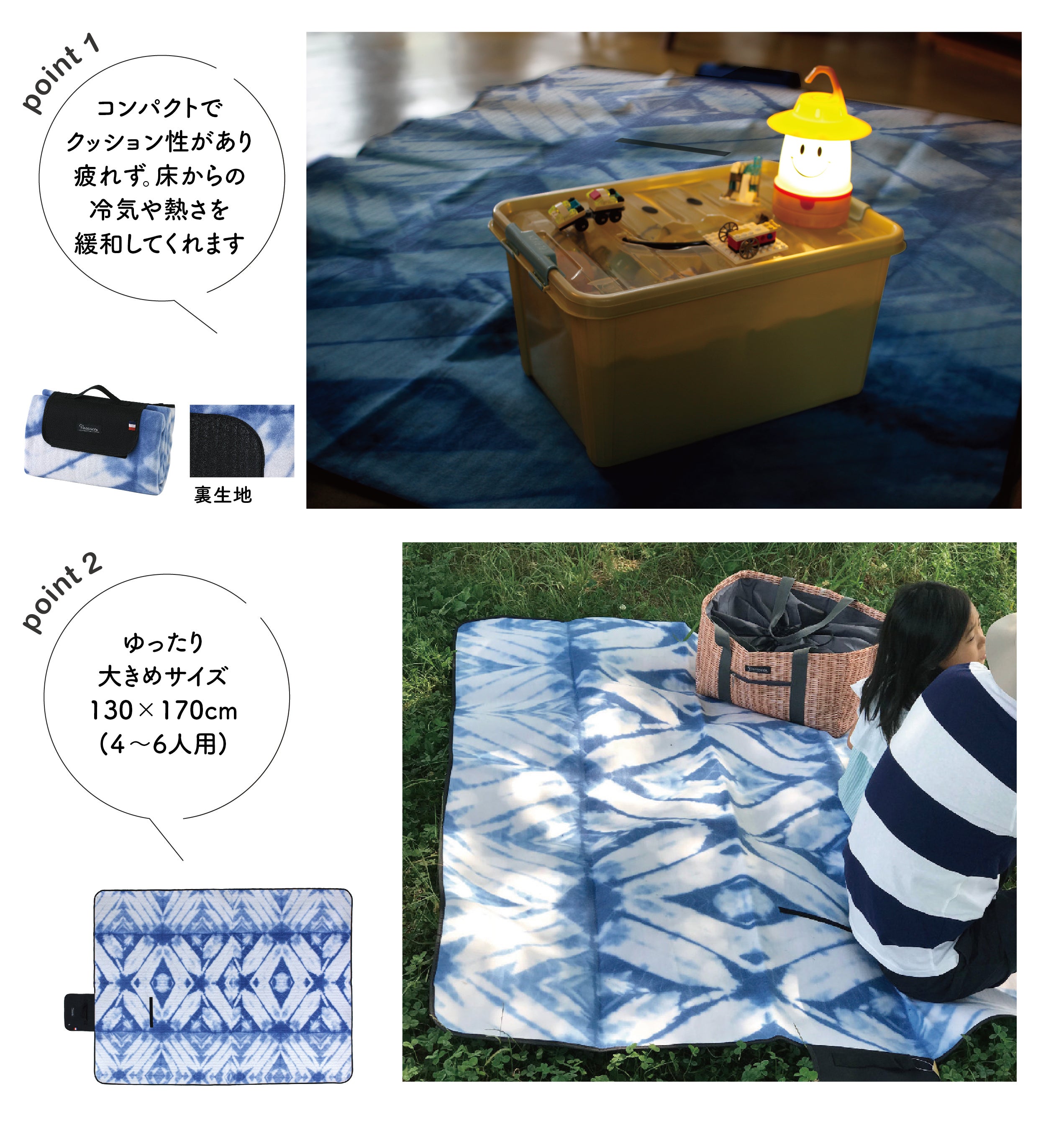 ゆったり大きめサイズなので、避難場でのスペースの確保ができ、インディゴ柄が家族の目印にもなります