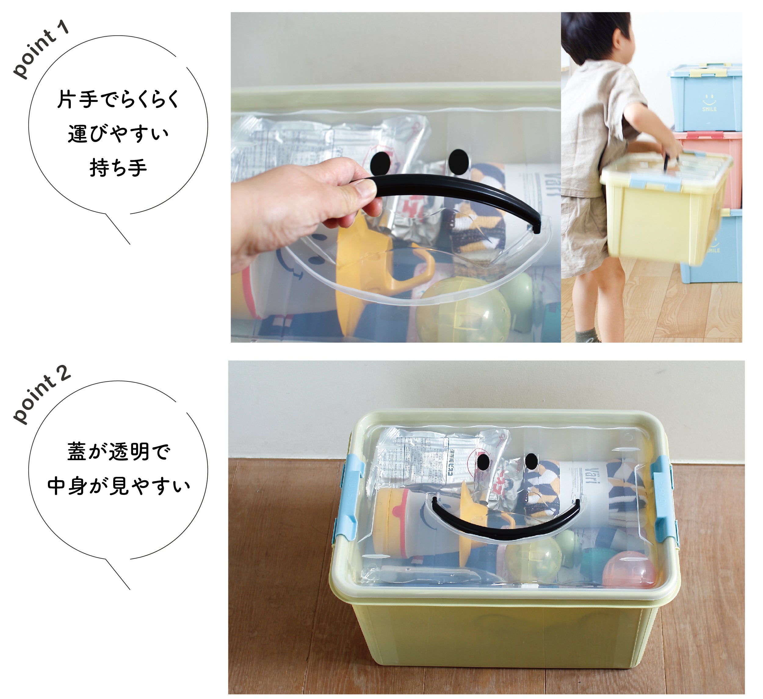 笑顔がかわいい透明フタのボックス。スマイルの口部分が持ち手になっていて、片手で持ち運びができます!