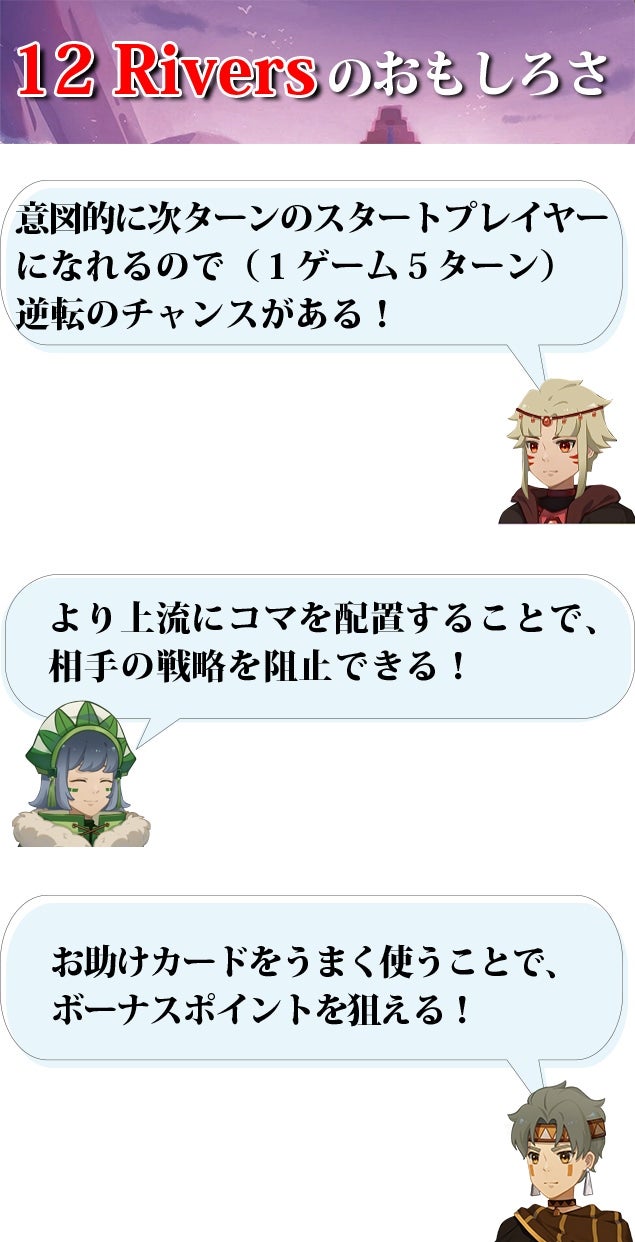 12Riversは、コンポーネンツが非常にしっかりしており手触りがよく、見た目から楽しめるボードゲームです。ルールはシンプルですが、相手の手を読みさまざまな戦略を練る楽しさや、目新しいギミックにみんなで盛り上がる楽しさもあり、ボードゲーム初心者と上級者、子供と大人が一緒に楽しむことができる素晴らしいボードゲームです。