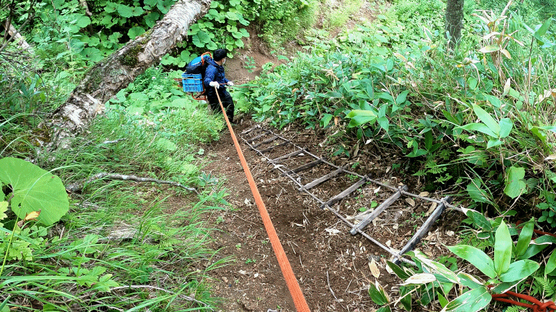 調査を行うにあたり、摩周湖は非常に厳しい環境です。調査時には人の手で調査船の燃料や水質調査機材などの重たい荷物を持ち運び、約200mもの高低差のある急斜面を沢づたいに下りていきます。事前準備としてハシゴやロープの設置なども当協議会にて行っています。