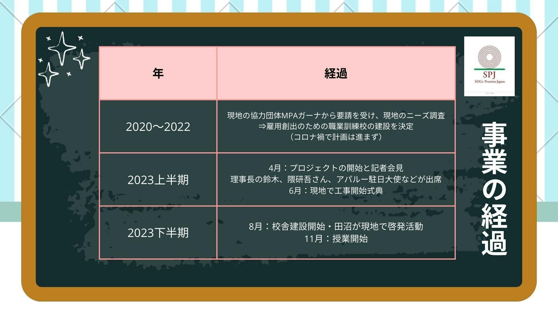 こんにちは!認定NPO法人SDGs・プロミス・ジャパン(通称SPJ)です。SPJは、SDGsの達成に向けて、アフリカをはじめとする発展途上国にて、貧しい人々のための支援活動(難民支援、女児の教育支援、顧みられない熱帯病(NTDs)のアドボカシー活動など)に取り組んできました。この職業訓練校建設事業は日本のNGO連携無償資金協力(ODA:政府開発援助)の一事業です。ODAでは、建設費の大半を賄っていますが、学生が継続的に学校に通うための資金が必要になり、クラウドファンディングを実施します!将来的には、奨学金制度を整備することも目指しています。