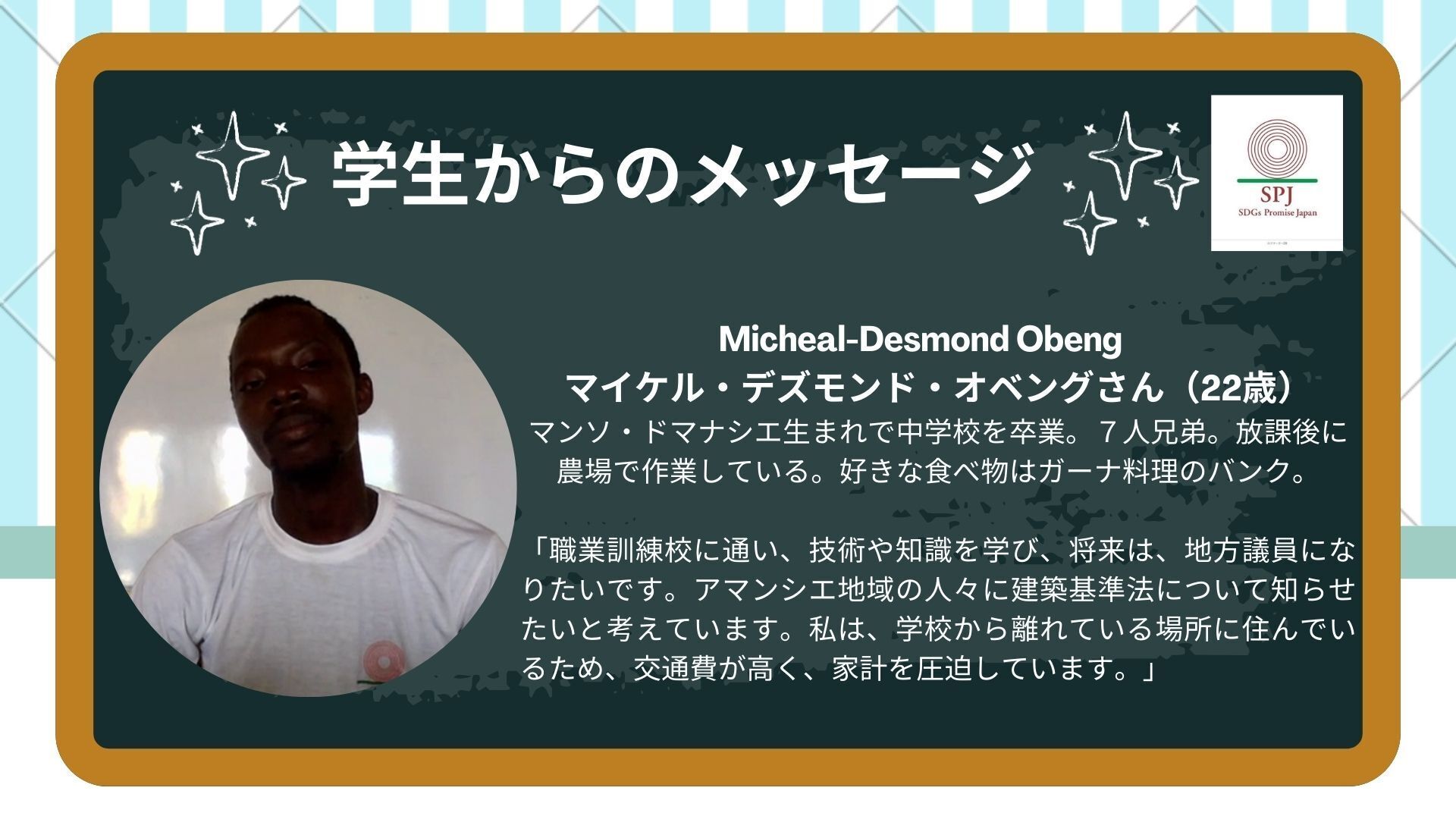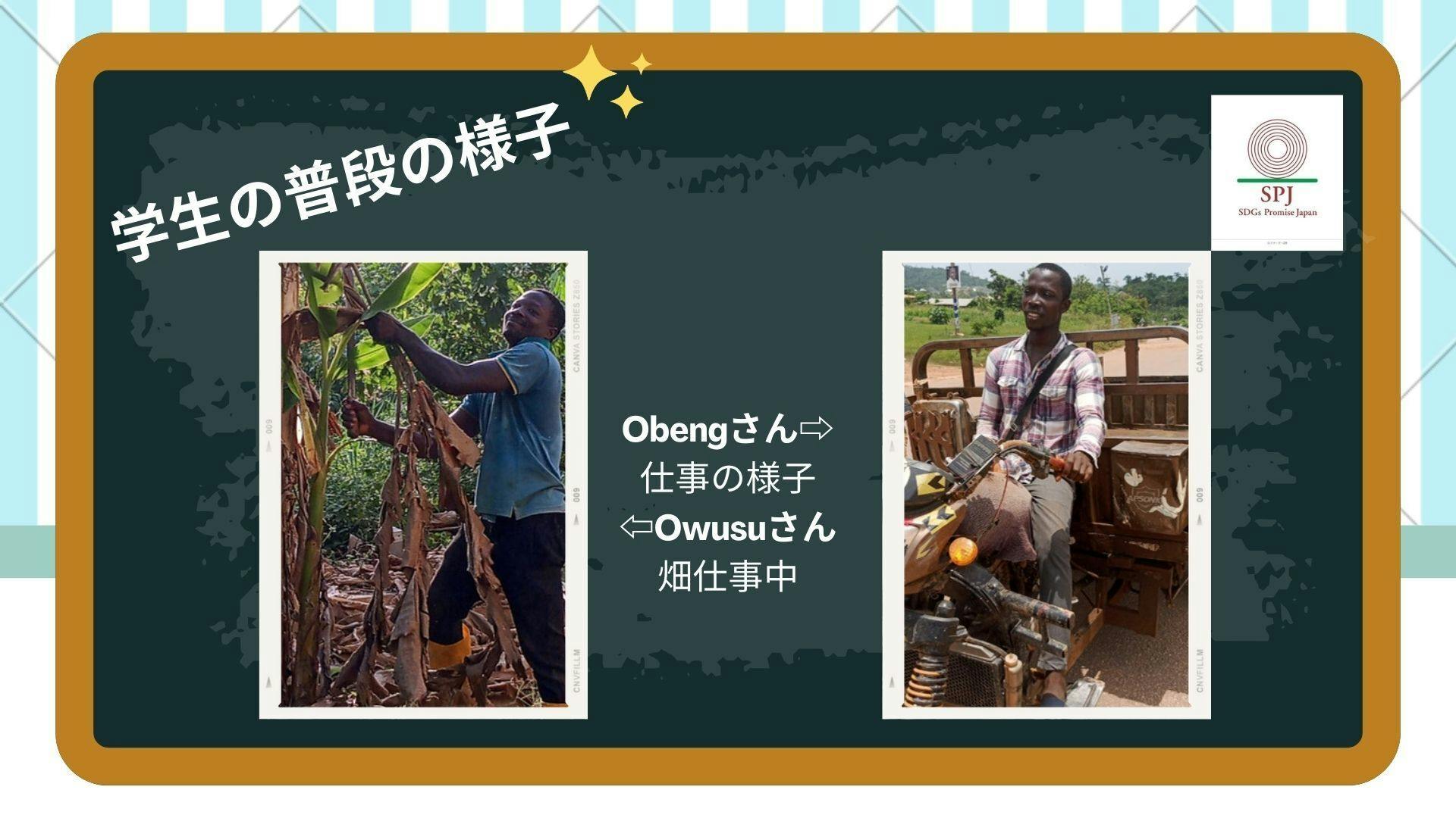 実際に職業訓練校に通う5名の学生が、学校で学んでいることや将来の夢などを語ってくれました!日本で学生と言えば、20歳前後の人を一般には想像するかと思います。しかし、ガーナでは中学校までの義務教育はほとんどの人が受けられますが、より高いスキルが得られる高等教育については、貧困などから一部の人しか受けることができません。メッセージを頂いた5人の内2人は30歳を超えています。皆さんからいただいたご支援で、学び始めるのは何歳になってからでも遅くないことを体現してくれます!そして、それが将来の貧困からの脱却につながります!
