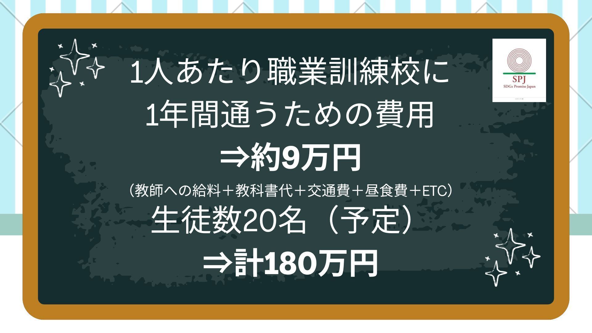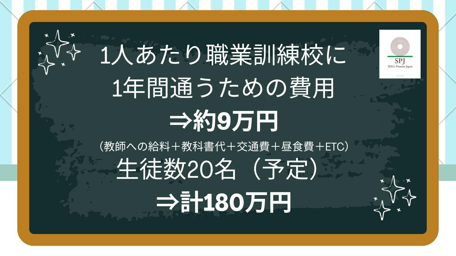 1人当たり年間9万円、学生数は校舎の完成に伴い20人になる予定であるため、年間180万円必要です。SPJからの資金や現地の資金も利用して運営に当たっていますが、現状では足りません。皆さまからご支援いただけるお金が集まるほど、次年度以降にも奨学金基金として用いることができます。また、今回のクラウドファンディング実施にあたっての広告費5万円も皆様の温かいサポートにより実現しております。