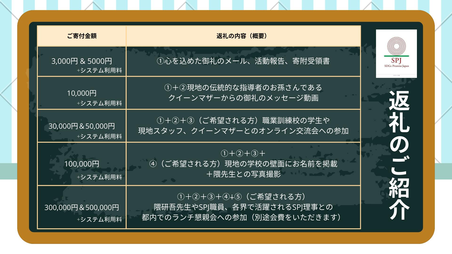 本クラウドファンディングは認定NPO法人であるSPJにご寄附を頂くという形になります。そのため、商品価値のある返礼をさせていただくことはできませんが、ご支援いただいた皆様に少しでもガーナに関心を持っていただけるようなバラエティに富んだ返礼をご用意しました!ご寄附額に応じて、様々な返礼を受け取る(参加する)ことができます。多額のご支援を頂いた場合、隈研吾先生や各界で活躍されるSPJの理事の皆さんとのランチ懇親会にもご参加いただけます。