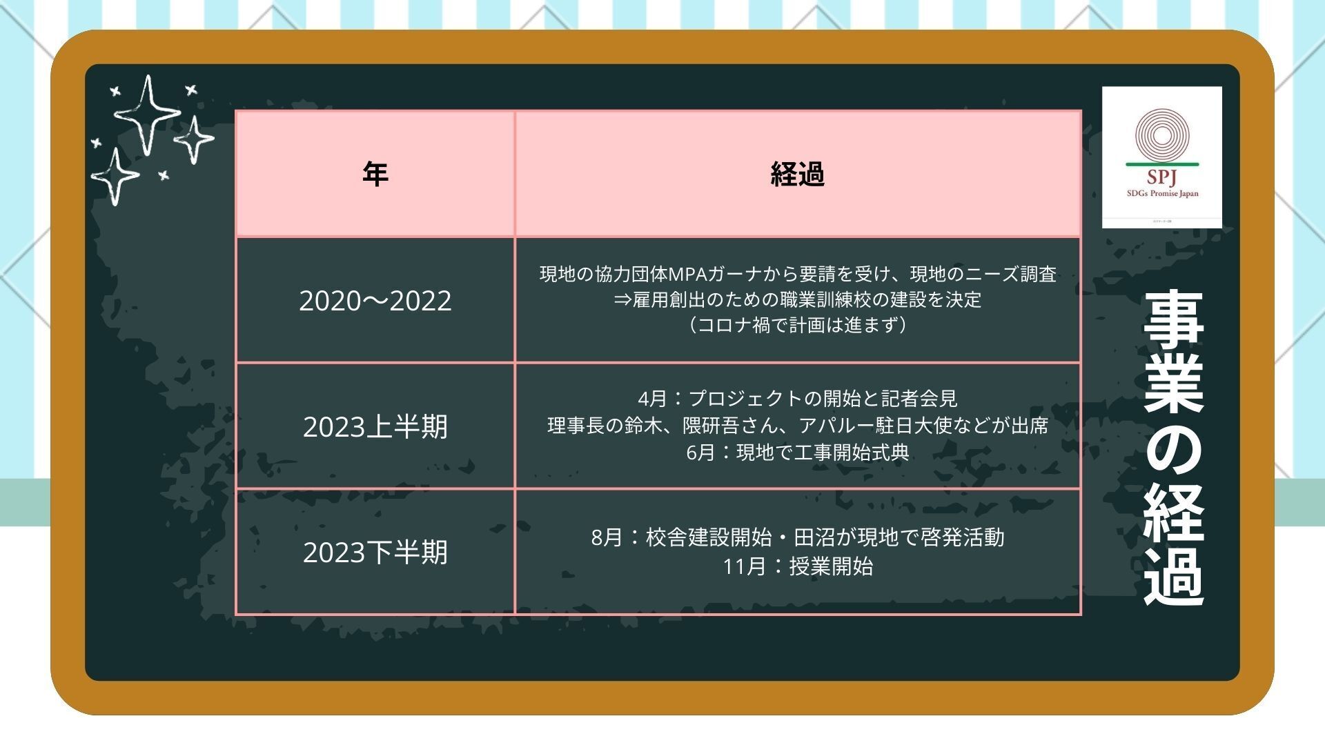 2024/06/19 11:05ご支援いただいた皆様ついに200万円のクラウドファンディングが達成されました!皆様からの暖かいご支援とご協力に心から感謝いたします。SPJとしても最大規模のクラウドファンディングの挑戦となりましたが、なんとか達成することができ安堵の思いと、また、皆様からいただいたお金を学生たちの学びに役立てるべく身の引き締まる思いです。そして、残り期間はわずかですが、230万円のネクストゴールを設定いたしました。ぜひ皆様にも引き続きご拡散にご協力いただきたく思います。校舎の内装工事窓枠も隈研吾先生の建築らしく「木」がふんだんに利用されています必死に実習を頑張っています!職業訓練校の建設は最終段階にきました。また学生の授業では実技演習が開始されています。学生たちは毎日建築と向き合って頑張っています! もっと見る埼玉のガーナ料理店にポスターを掲載しました!