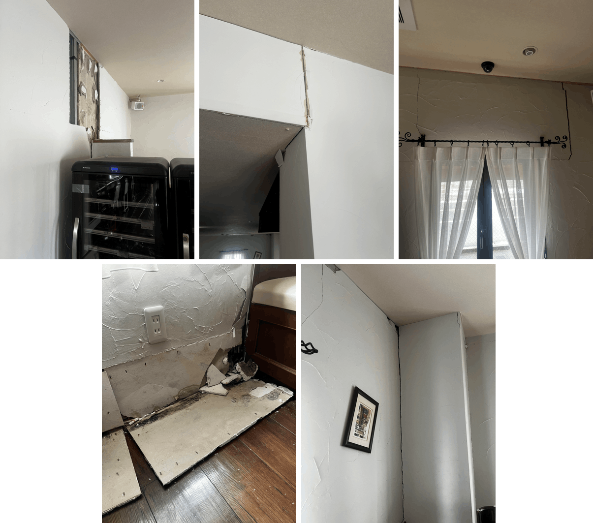 ▲外壁だけでなく内壁までもが剥がれ落ち、かなりの修繕が必要であることは一目でわかりました。大きな冷蔵庫も倒れ、大切に使ってきた作家さんの器やグラスもたくさん割れてしまいました。