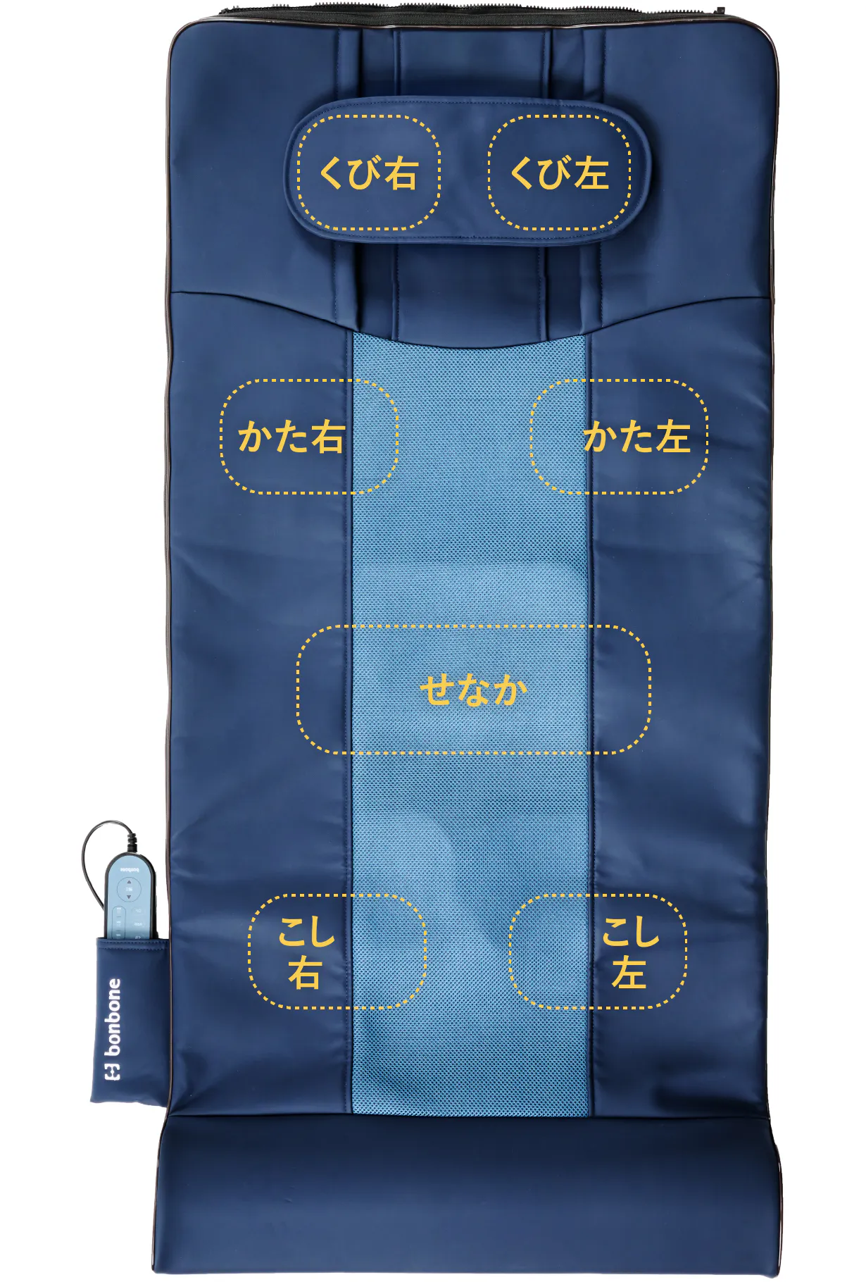 エアバッグは『首2、肩2、背中1、腰2』の7箇所に配置。自分では動かしにくい胸椎をエアーの力で簡単にストレッチできます。