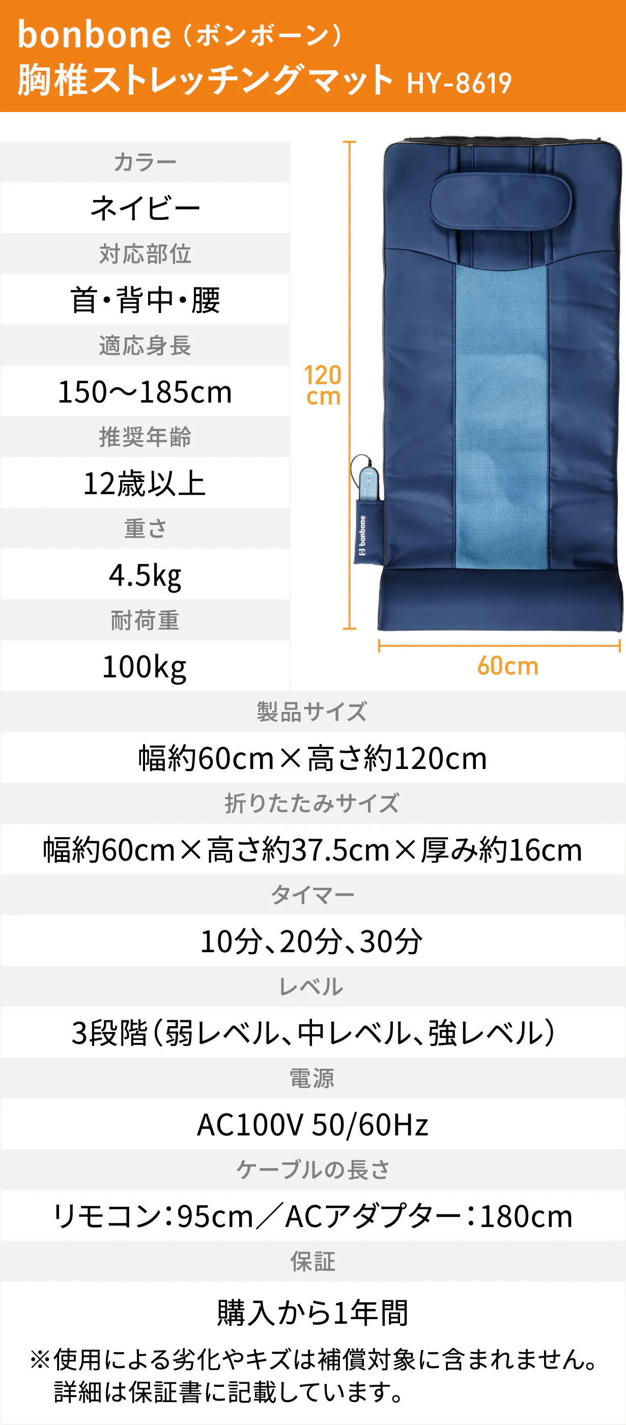 また、一般的なストレッチの機械は直接に肩・腰などの部位にアプローチしますが、bonbone(ボンボーン) 胸椎ストレッチングマットは首・肩・腰などの周辺部位をお手軽にストレッチすることを目的としています。そうする事で日常生活や仕事などで首・肩・腰への負担を軽減し、バランスの取れた姿勢へとサポートします。