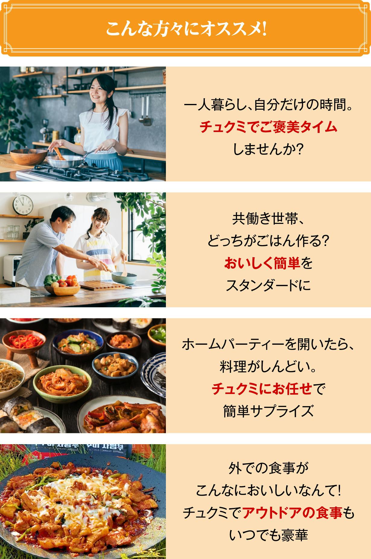 市販の野菜で調理可能!好きな野菜を入れて自分だけのオリジナルのチュクミを楽しめます。自分好みの食べ方をしたいというお悩みも一掃!