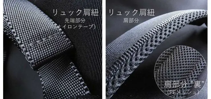 ・[バッグ表生地]ナイロン(中空糸)×PVC貼/[裏地]ナイロン/[持ち手/引手]牛革/[リュック肩紐]ナイロンテープ/PEメッシュ