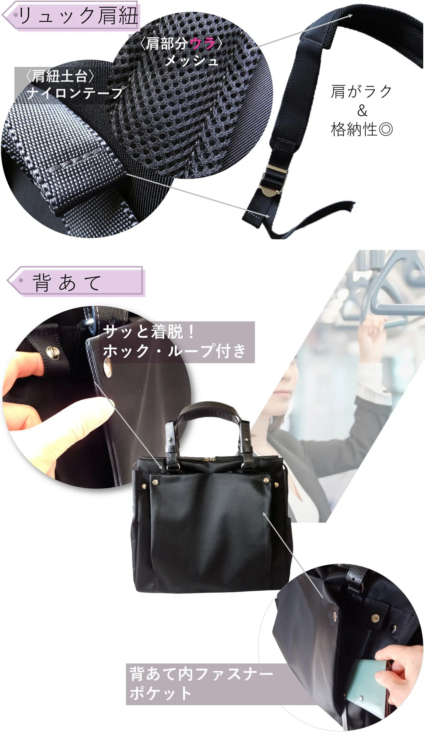 「一瞬に」「完全に」 肩ひも格納でスマートに 解決!