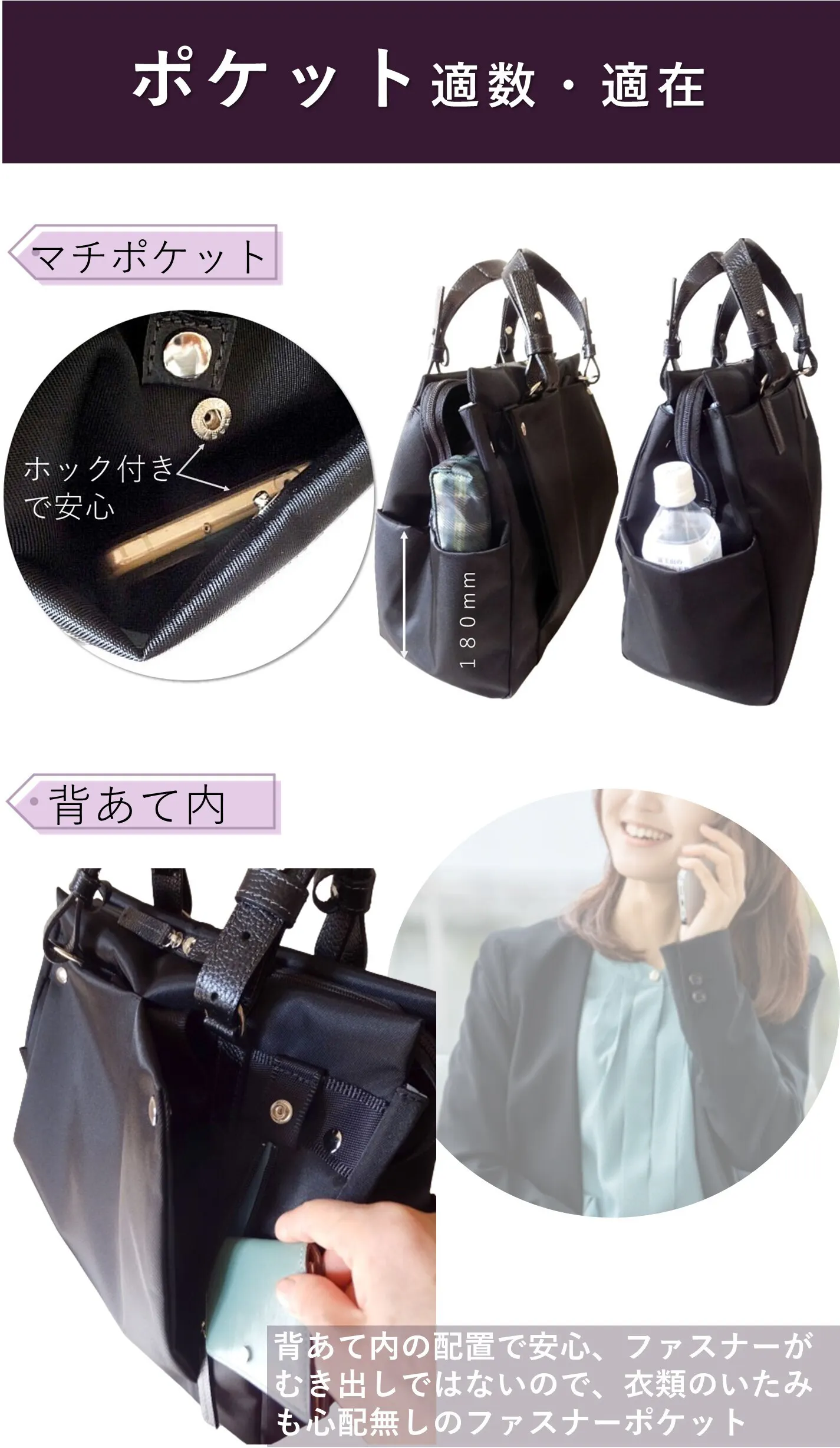 ファスナーポケットは背あてを開閉しなくても使用可能 「サイド(マチ)ポケット」は、口元にホックがついているのでハンカチ・ティッシュ等の収納に便利(*ペットボトル等収納時はホックは閉められません)大事な小物は背面の「背あて内」の「ファスナーポケット」へ ファスナーが表に出ていないので衣類が傷みにくい点も◎