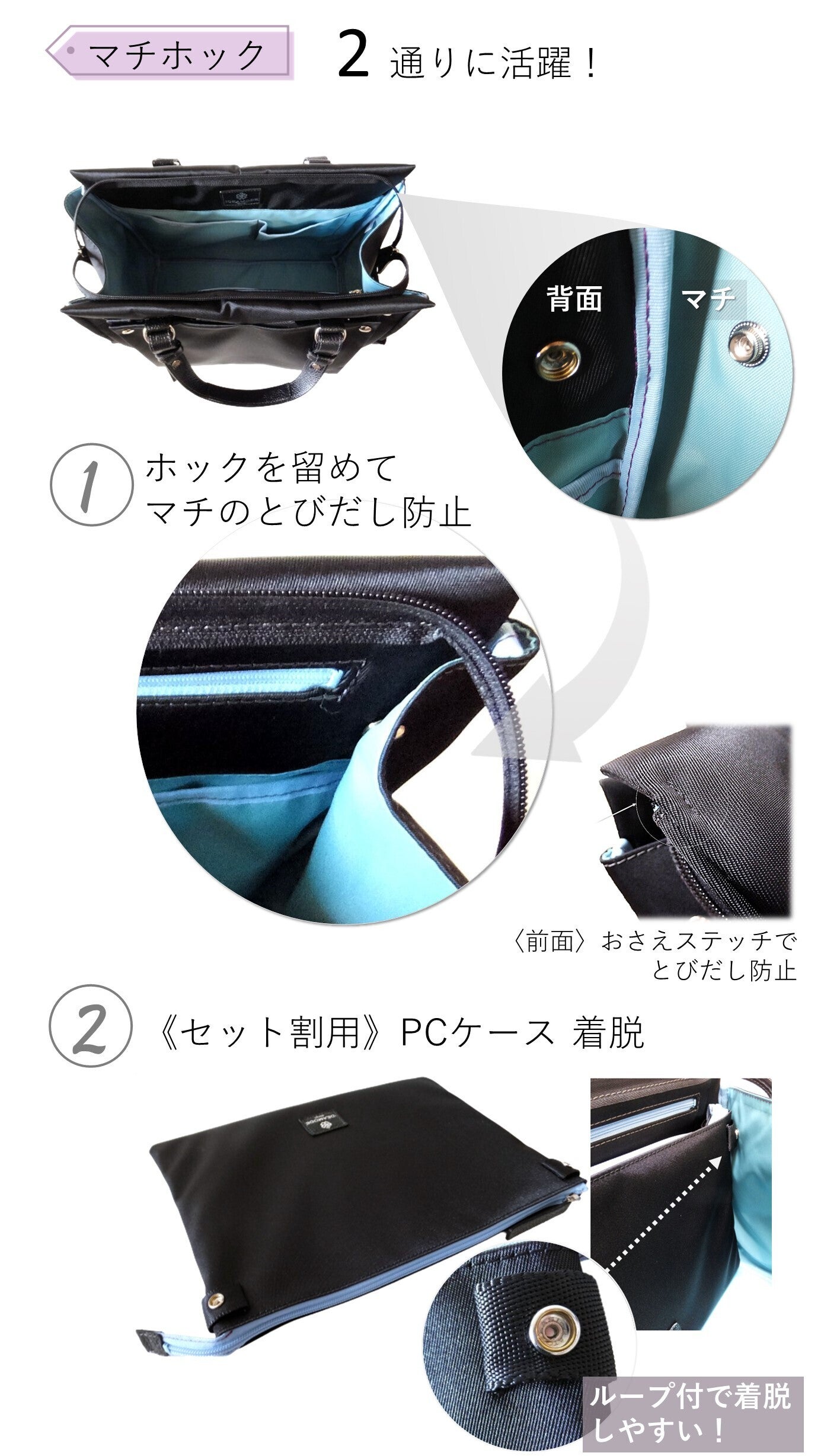 ・「PC着脱 兼 マチ折れ込み用ホック」は用途以外の目的に使用しないでください