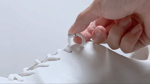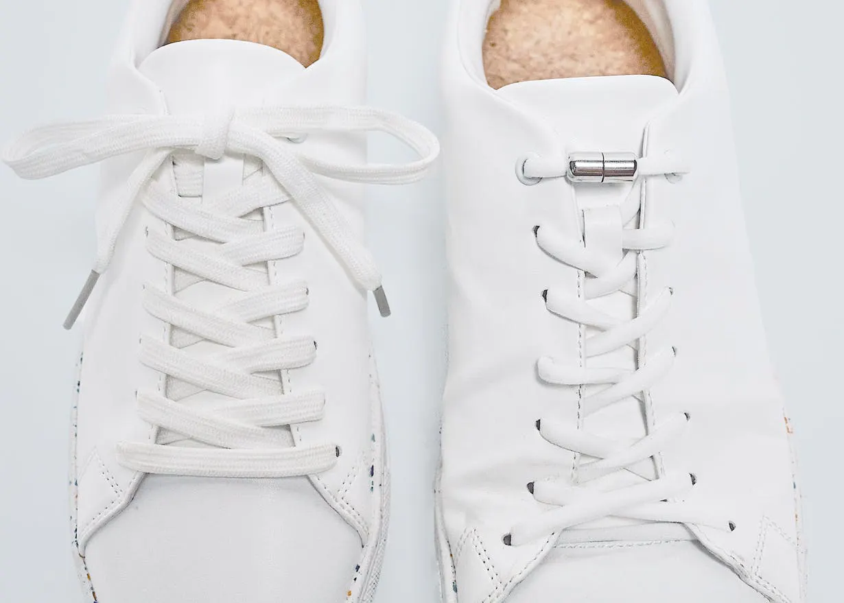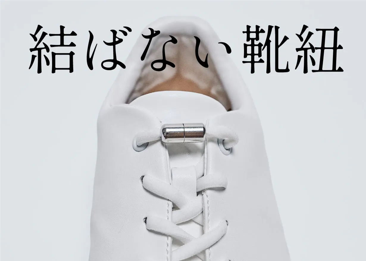 一つは最初から付いている「普通の紐」です。見た目シンプルで「品の良い」「大人白スニ」のそのままにイメージで履けます。もう一つはご紹介した「伸びる靴紐+スマートジョイント」をお付けします。ご自身の足に合わせて調整できます。是非、ご体感ください!