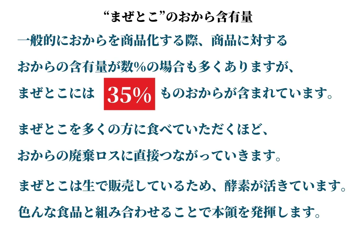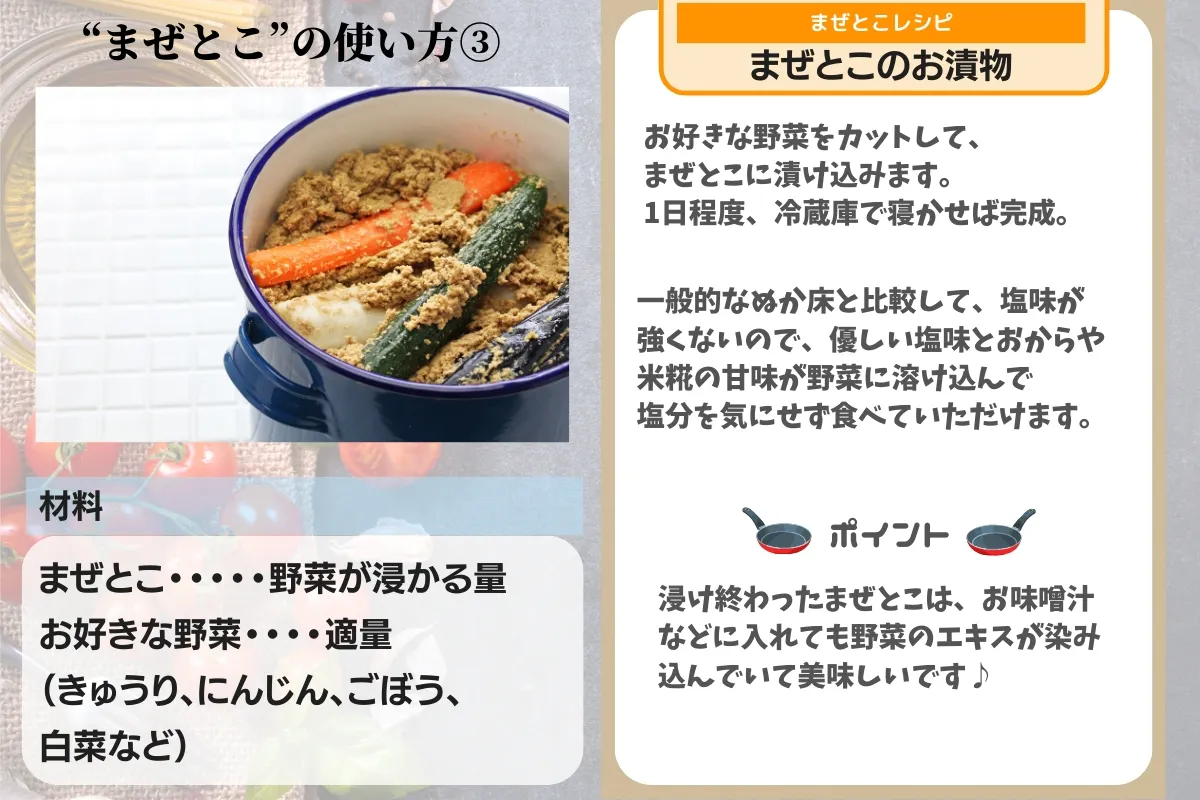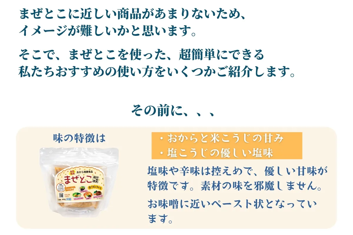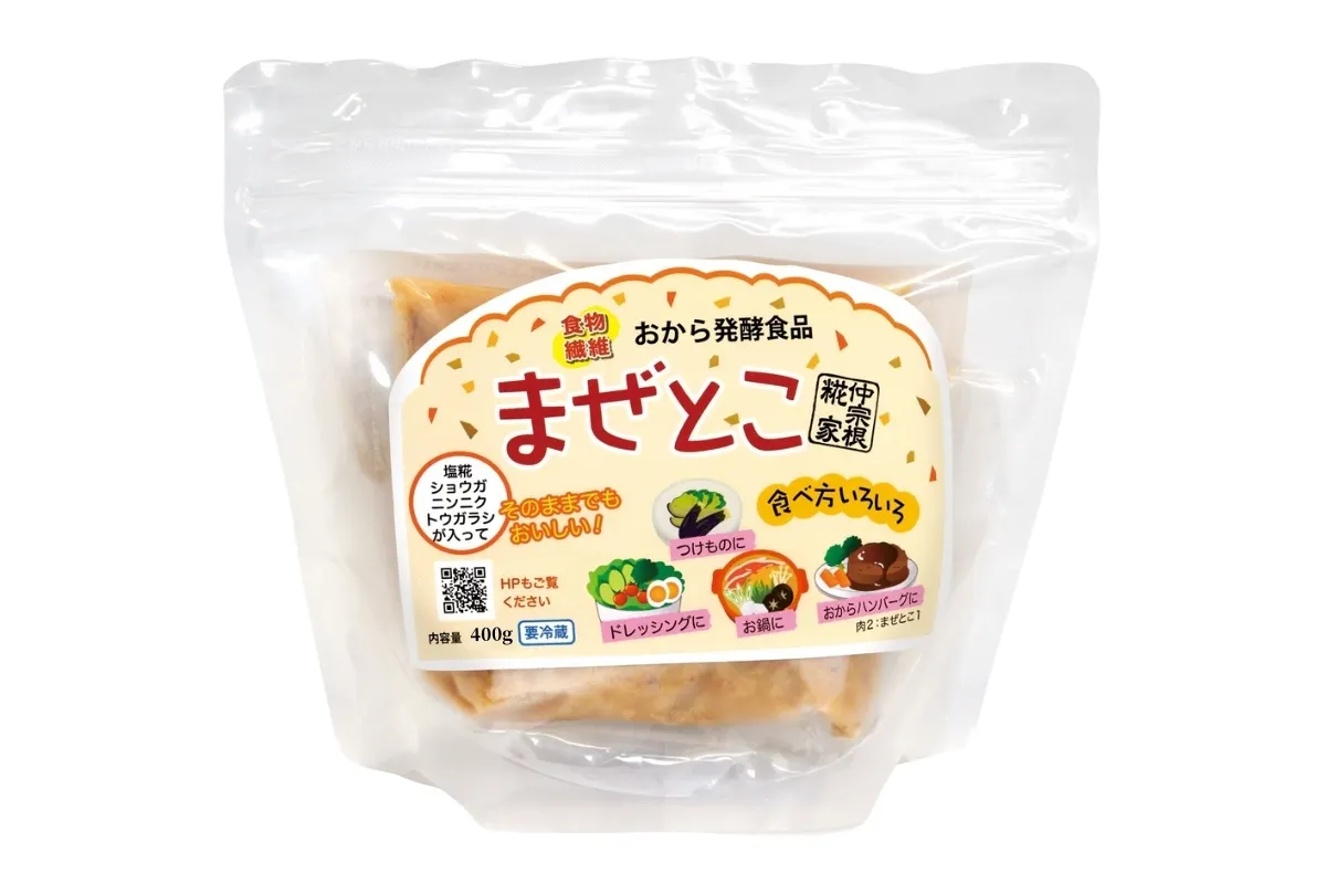 ・まぜとこ:おからと米糀を混ぜて発酵させ、塩糀やニンニク、生姜、唐辛子で味付けをした万能調味料です。