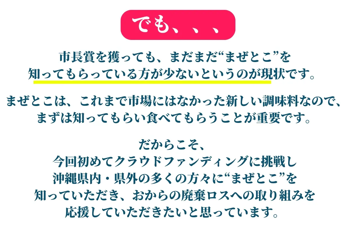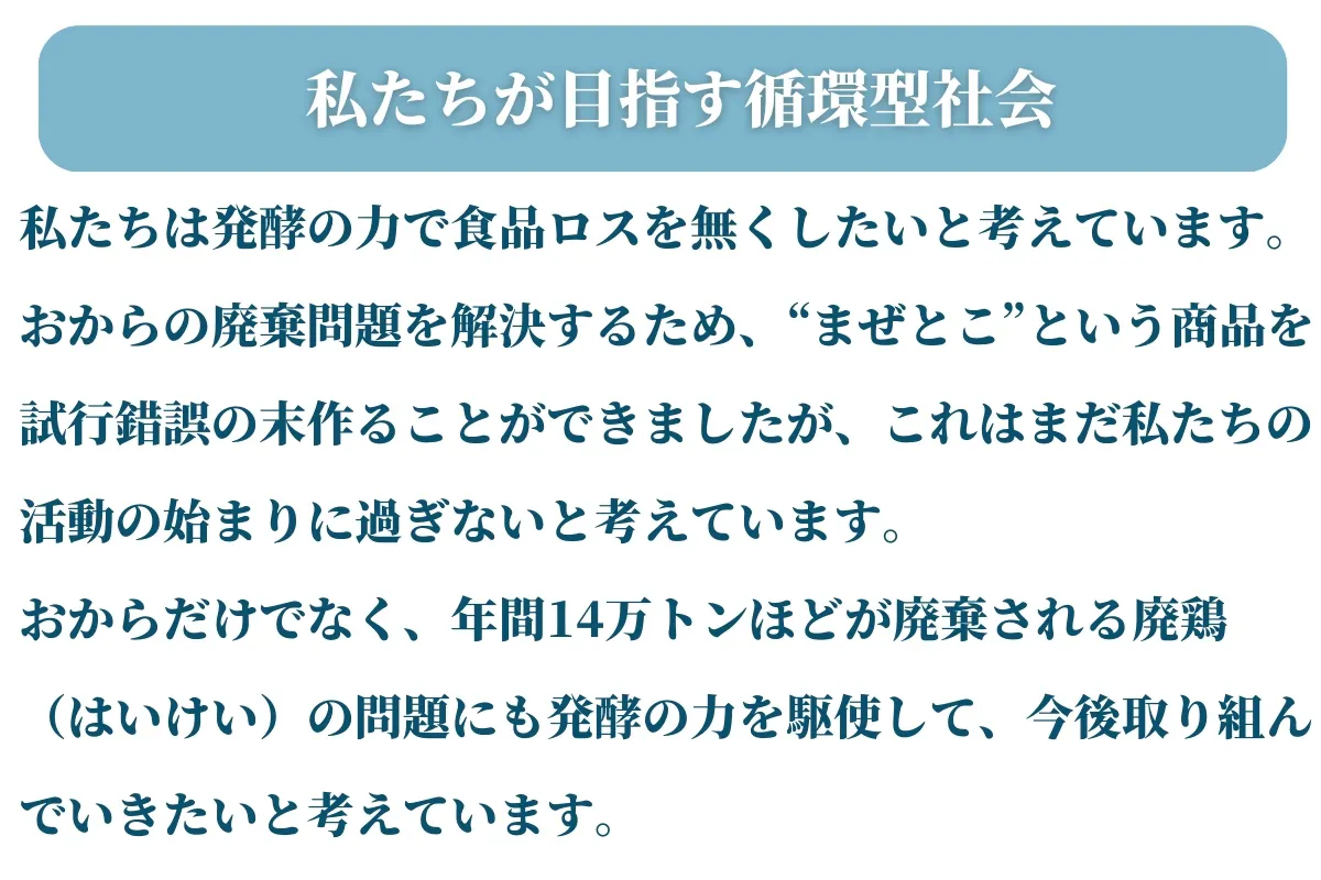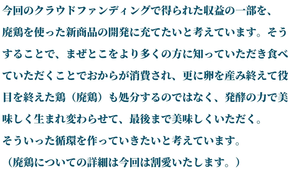 2024/06/08 08:12昨日、6月7日(金)、クラウドファンディングを無事に終えることができました。結果的に、支援総額:970,500円支援者数:94名と目標金額を大きく上回るご支援をいただきました。これだけ多くの皆様に応援いただいたこと、改めて感謝申し上げます。今回、初めてクラウドファンディングに挑戦してみましたが、多くの方々から応援いただけたこと、そして、皆様からの応援コメントがとても嬉しく、私たちの背中を押してくれました。”まぜとこ”というおからの廃棄課題を解決するために生まれた商品を、多くの方々に知っていただき、そして私たちの取り組みを知っていただけたことを大変嬉しく思います。小さな沖縄の糀会社ではありますが、志は大きく、これからも発酵の力でおからの問題に継続的に取り組んでいきたいと思います。そして、おからだけでなく、廃棄されて捨てられてしまうような食品も、発酵の力で生まれ変わらせて、食品の廃棄ロスの解決に繋げていきたいと思います。ご支援くださたった皆様には、これから一つ一つ心を込めて返礼(リターン)を準備して参ります。(おから味噌2kgを選択くださった皆様には、お味噌の仕込みに最低でも3ヶ月かかることから、早くとも9月中の発送となること予めご了承いただけますと幸いです。)これからも仲宗根糀家の活動にご注目いただけますととても嬉しく思います。改めまして、今回、ご支援・応援をくださった皆様本当にありがとうございました。株式会社仲宗根糀家一同 もっと見る